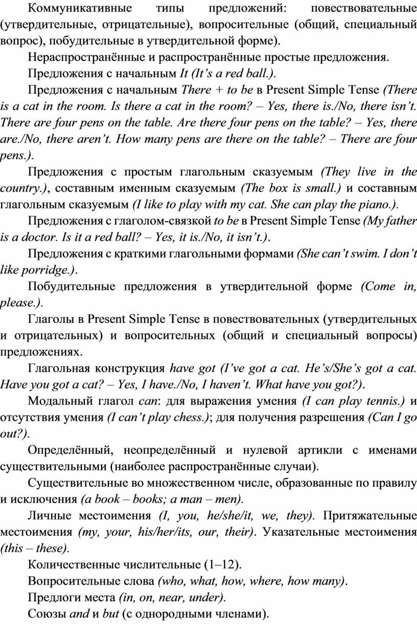 Коммуникативные типы предложений: повествовательные (утвердительные, отрицательные), вопросительные (общий, специальный вопрос), побудительные в утвердительной форме).