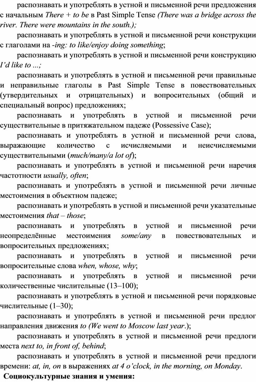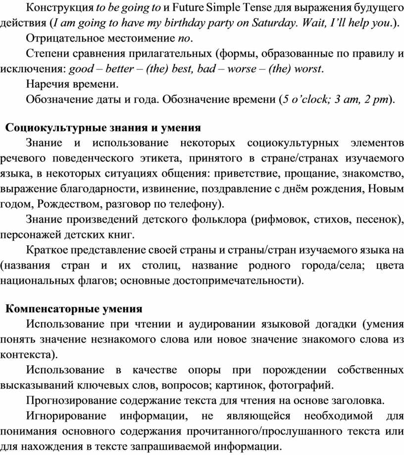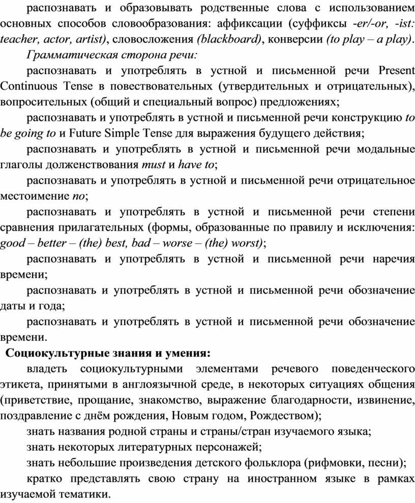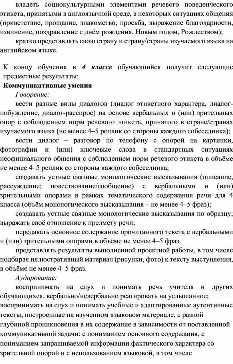 · формирование предпосылок социокультурной/межкультурной компетенции, позволяющей приобщаться к культуре, традициям, реалиям стран/страны изучаемого языка, готовности представлять свою страну, её культуру в условиях межкультурного общения, соблюдая речевой этикет и адекватно используя имеющиеся речевые и неречевые средства общения;