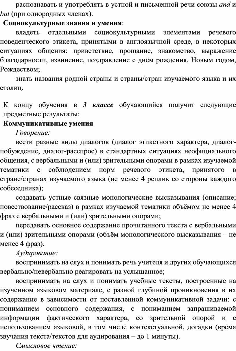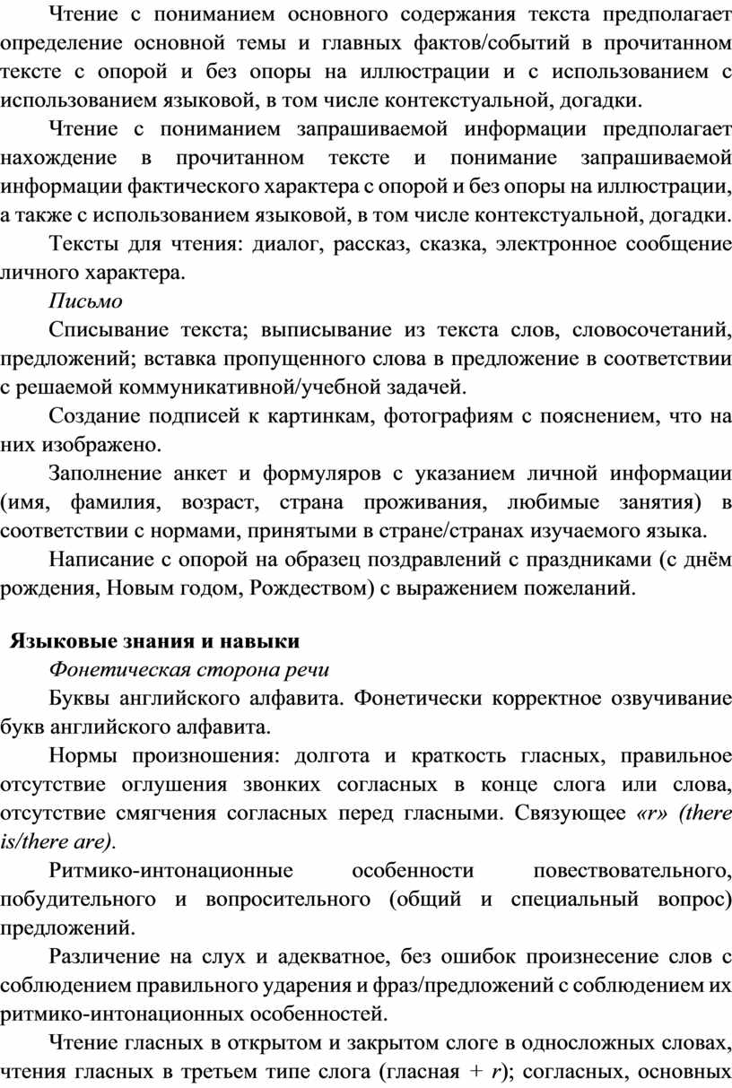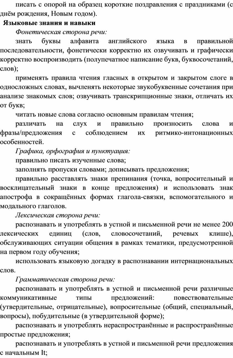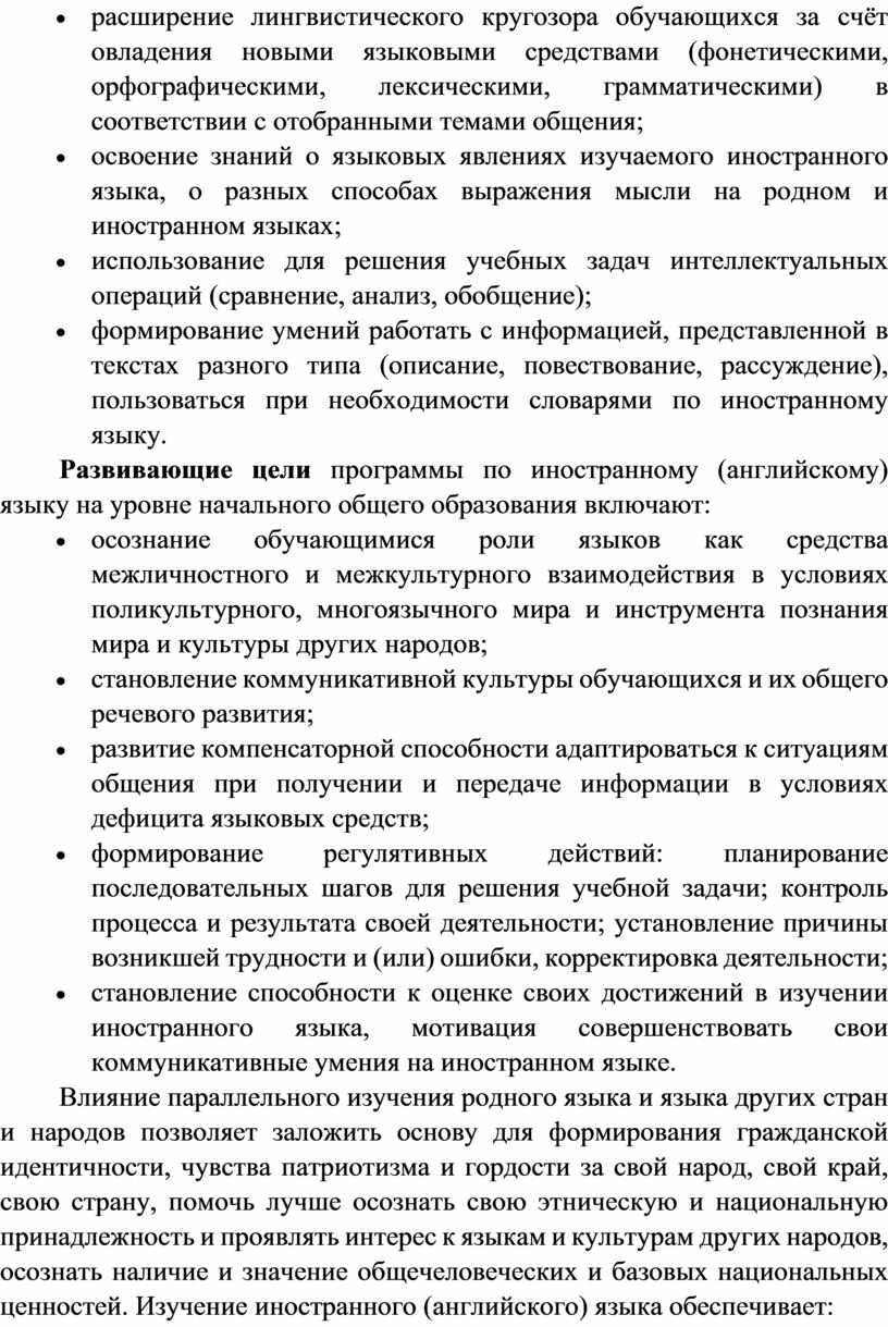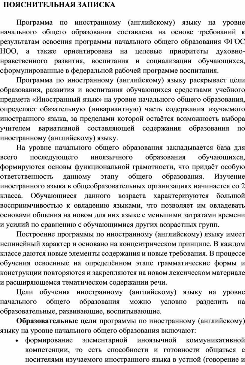 Программа по иностранному (английскому) языку раскрывает цели образования, развития и воспитания обучающихся средствами учебного предмета «Иностранный язык» на уровне начального общего образования, определяет обязательную (инвариантную) часть содержания изучаемого иностранного языка, за пределами которой остаётся возможность выбора учителем вариативной составляющей содержания образования по иностранному (английскому) языку.