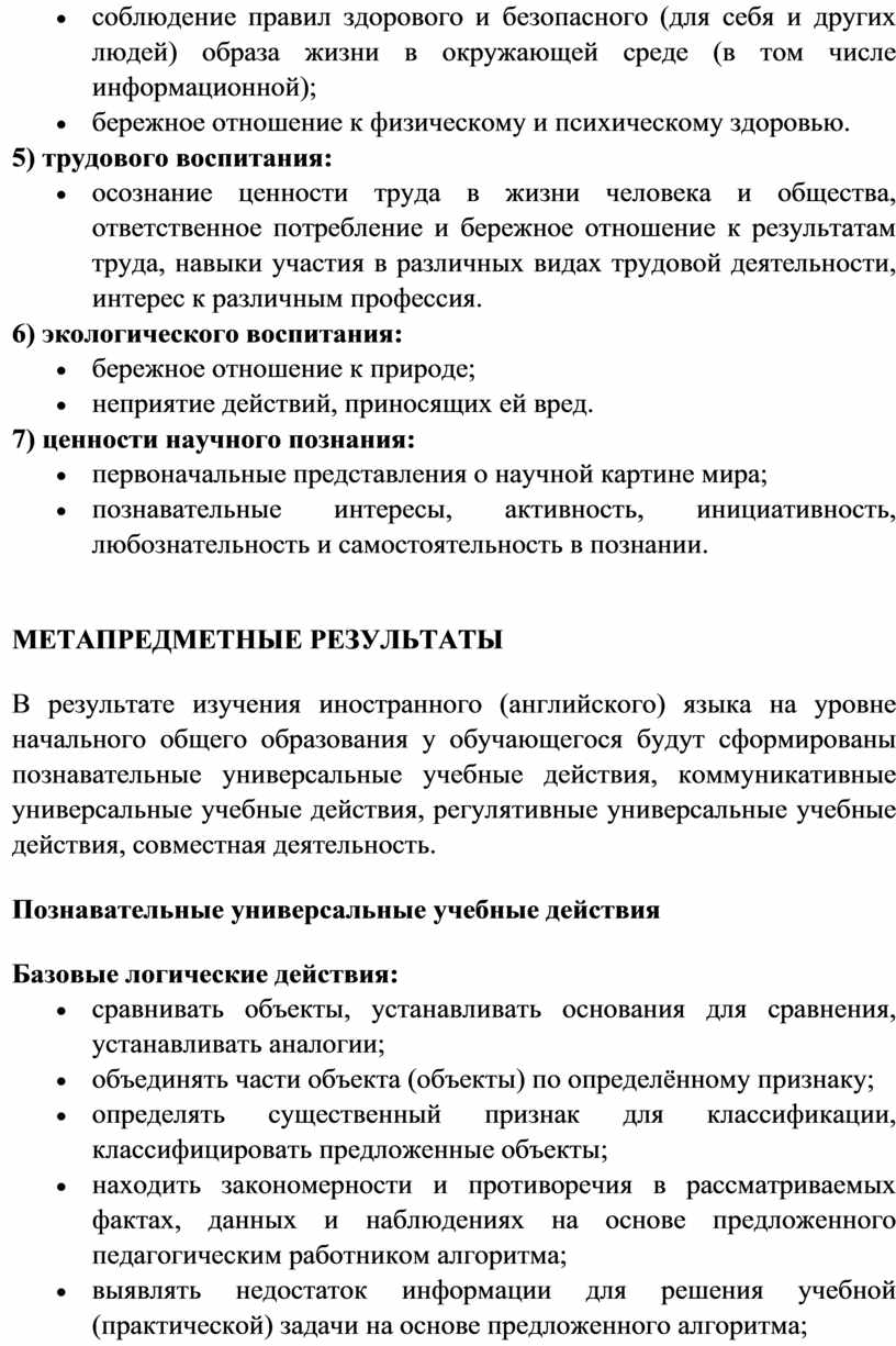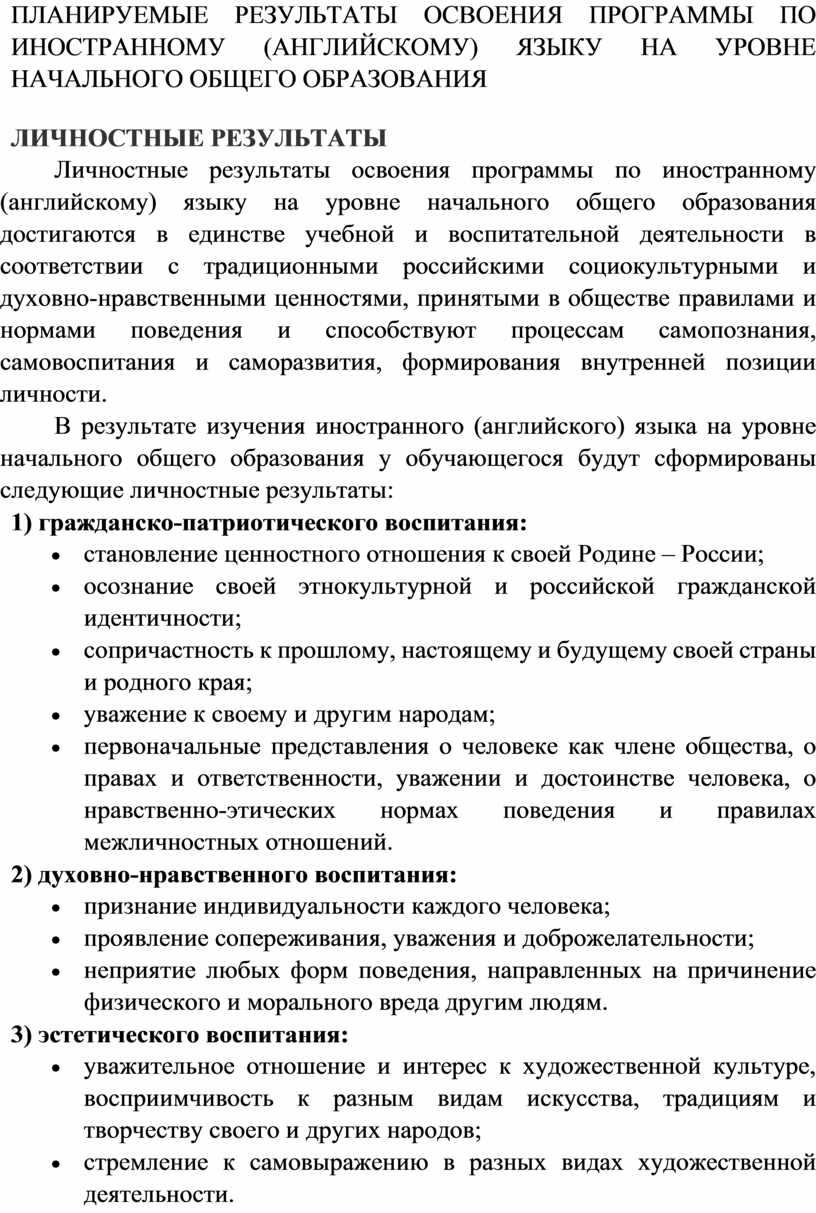 Программа по иностранному (английскому) языку на уровне начального общего образования составлена на основе требований к результатам освоения программы начального общего образования ФГОС НОО, а также ориентирована на целевые приоритеты духовно-нравственного развития, воспитания и социализации обучающихся, сформулированные в федеральной рабочей программе воспитания.