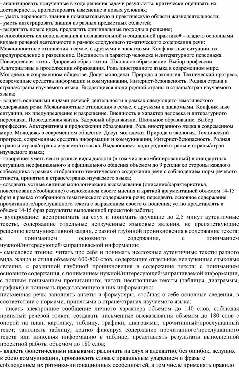 - владеть основными видами речевой деятельности в рамках следующего тематического содержания речи: Межличностные отношения в семье, с друзьями и знакомыми. Конфликтные ситуации, их предупреждение и разрешение. Внешность и характер человека и литературного персонажа. Повседневная жизнь. Здоровый образ жизни. Школьное образование. Выбор профессии. Альтернативы в продолжении образования. Роль иностранного языка в современном мире. Молодежь в современном обществе. Досуг молодежи. Природа и экология. Технический прогресс, современные средства информации и коммуникации, Интернет-безопасность. Родная страна и страна/страны изучаемого языка. Выдающиеся люди родной страны и страны/стран изучаемого языка; - говорение: уметь вести разные виды диалога (в том числе комбинированный) в стандартных ситуациях неофициального и официального общения объемом до 9 реплик со стороны каждого собеседника в рамках отобранного тематического содержания речи с соблюдением норм речевого этикета, принятых в стране/странах изучаемого языка; - создавать устные связные монологические высказывания (описание/характеристика, повествование/сообщение) с изложением своего мнения и краткой аргументацией объемом 14-15 фраз в рамках отобранного тематического содержания речи; передавать основное содержание прочитанного/прослушанного текста с выражением своего отношения; устно представлять в объеме 14-15 фраз результаты выполненной проектной работы; - аудирование: воспринимать на слух и понимать звучащие до 2,5 минут аутентичные тексты, содержащие отдельные неизученные языковые явления, не препятствующие решению коммуникативной задачи, с разной глубиной проникновения в содержание текста: с пониманием основного содержания, с пониманием нужной/интересующей/запрашиваемой информации; - смысловое чтение: читать про себя и понимать несложные аутентичные тексты разного вида, жанра и стиля объемом 600-800 слов, содержащие отдельные неизученные языковые явления, с различной глубиной проникновения в содержание текста: с пониманием основного содержания, с пониманием нужной/интересующей/запрашиваемой информации, с полным пониманием прочитанного; читать несплошные тексты (таблицы, диаграммы, графики) и понимать представленную в них информацию; письменная речь: заполнять анкеты и формуляры, сообщая о себе основные сведения, в соответствии с нормами, принятыми в стране/странах изучаемого языка; - писать электронное сообщение личного характера объемом до 140 слов, соблюдая принятый речевой этикет; создавать письменные высказывания объемом до 180 слов с опорой на план, картинку, таблицу, графики, диаграммы, прочитанный/прослушанный текст; заполнять таблицу, кратко фиксируя содержание прочитанного/прослушанного текста или дополняя информацию в таблице; представлять результаты выполненной проектной работы объемом до 180 слов; - владеть фонетическими навыками: различать на слух и адекватно, без ошибок, ведущих к сбою коммуникации, произносить слова с правильным ударением и фразы с соблюдением их ритмико-интонационных особенностей, в том числе применять правило отсутствия фразового ударения на служебных словах; владеть правилами чтения и осмысленно читать вслух аутентичные тексты объемом до 150 слов, построенные в основном на изученном языковом материале, с соблюдени