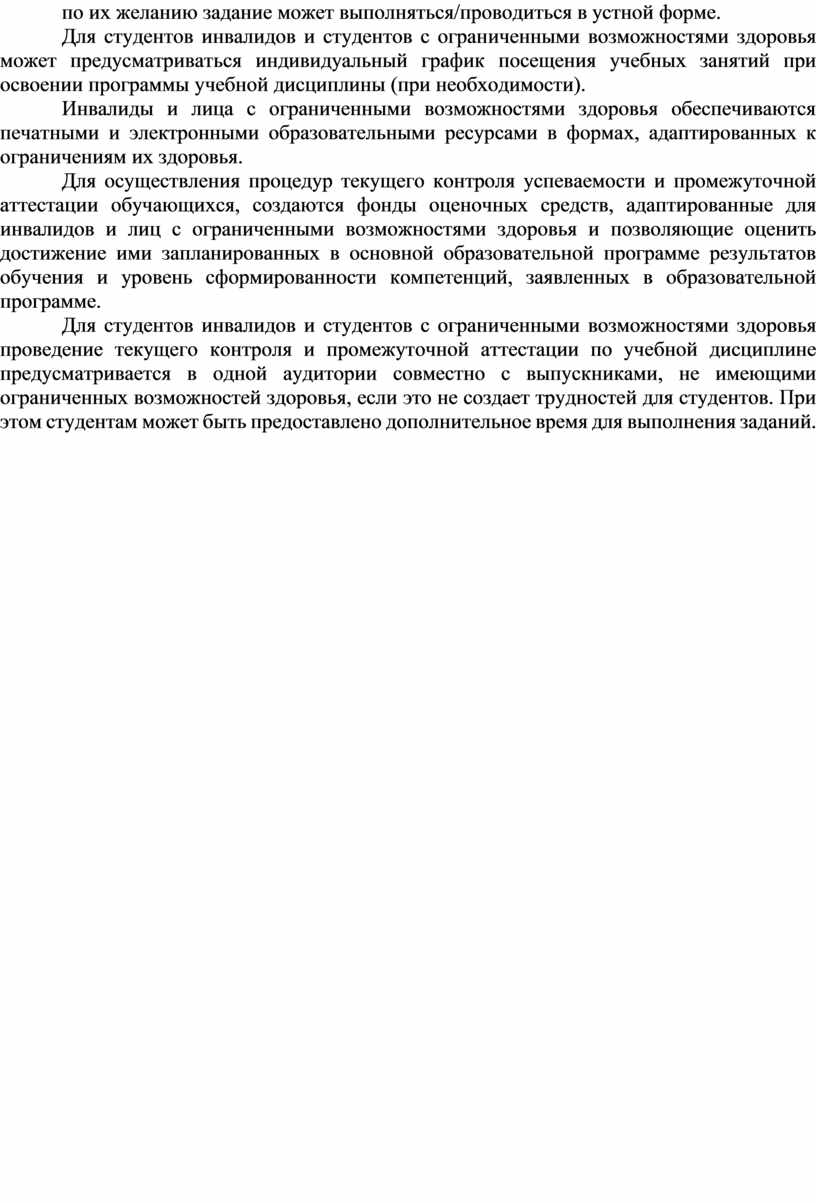 Для студентов инвалидов и студентов с ограниченными возможностями здоровья проведение текущего контроля и промежуточной аттестации по учебной дисциплине предусматривается в одной аудитории совместно с выпускниками, не имеющими ограниченных возможностей здоровья, если это не создает трудностей для студентов. При этом студентам может быть предоставлено дополнительное время для выполнения заданий.