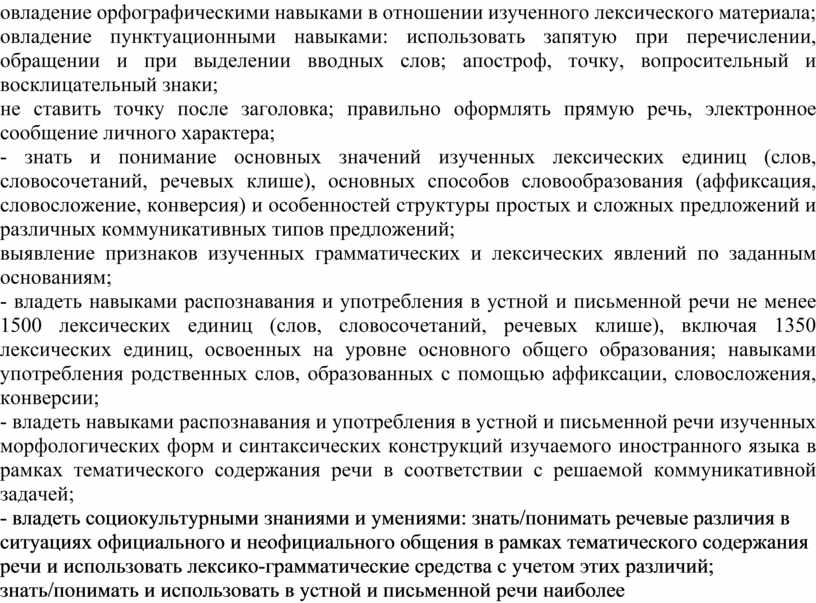 - аудирование: воспринимать на слух и понимать звучащие до 2,5 минут аутентичные тексты, содержащие отдельные неизученные языковые явления, не препятствующие решению коммуникативной задачи, с разной глубиной проникновения в содержание текста: с пониманием основного содержания, с пониманием нужной/интересующей/запрашиваемой информации; - владеть навыками распознавания и употребления в устной и письменной речи не менее 1500 лексических единиц (слов, словосочетаний, речевых клише), включая 1350 лексических единиц, освоенных на уровне основного общего образования; навыками употребления родственных слов, образованных с помощью аффиксации, словосложения, конверсии; - иметь опыт практической деятельности в повседневной жизни: участвовать в учебно-исследовательской, проектной деятельности предметного и межпредметного характера с использованием материалов на изучаемом иностранном языке и применением информационно-коммуникационных технологий; соблюдать правила информационной безопасности в ситуациях повседневной жизни и при работе в информационно-телекоммуникационной сети "Интернет" (далее - сеть Интернет); использовать приобретенные умения и навыки в процессе онлайн-обучения иностранному языку; использовать иноязычные словари и справочники, в том числе информационно-справочные системы в электронной форме |