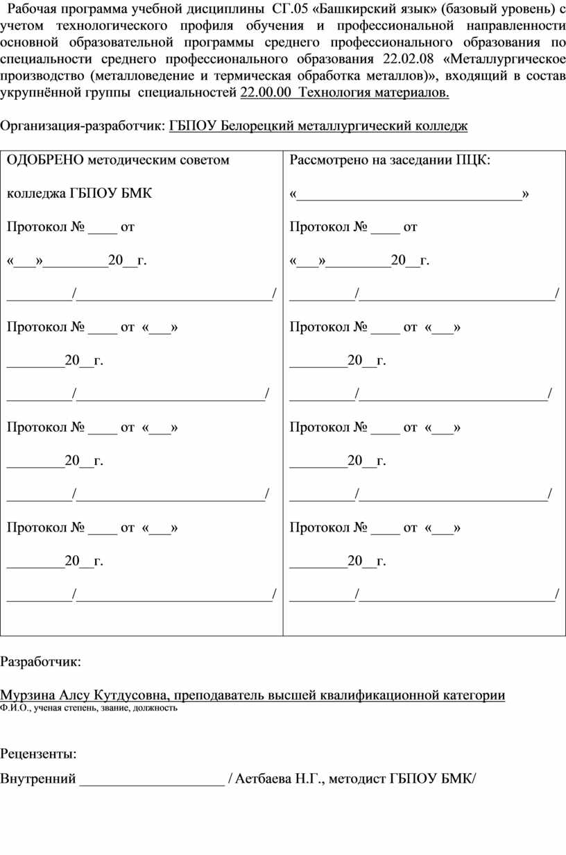 Рабочая программа учебной дисциплины СГ.05 «Башкирский язык» (базовый уровень) с учетом технологического профиля обучения и профессиональной направленности основной образовательной программы среднего профессионального образования по специальности среднего профессионального образования 22.02.08 «Металлургическое производство (металловедение и термическая обработка металлов)», входящий в состав укрупнённой группы специальностей 22.00.00 Технология материалов.