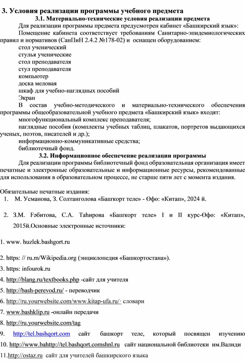 В состав учебно-методического и материально-технического обеспечения программы общеобразовательной учебного предмета «Башкирский язык» входят: