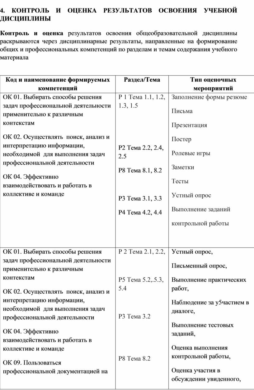 4. КОНТРОЛЬ И ОЦЕНКА РЕЗУЛЬТАТОВ ОСВОЕНИЯ учебной ДИСЦИПЛИНЫ