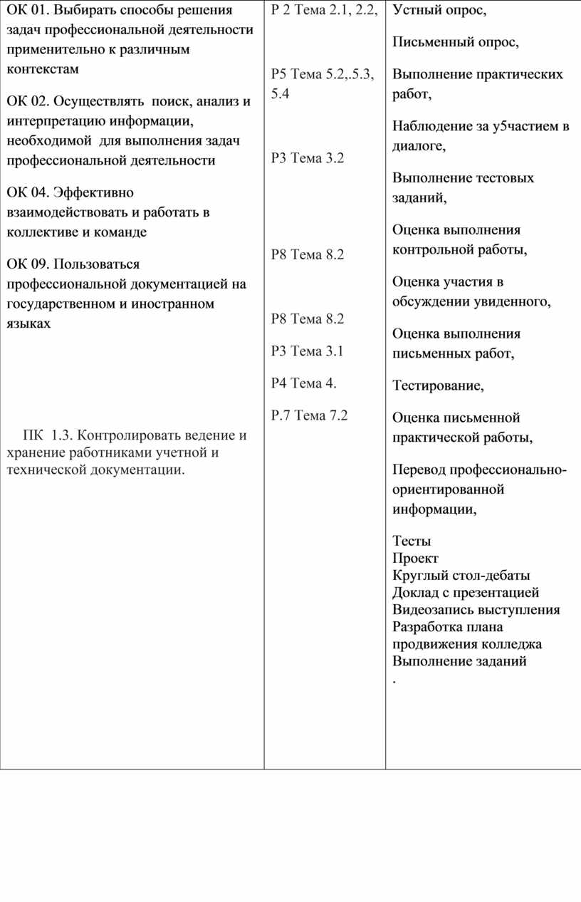Устный опрос, Письменный опрос, Выполнение практических работ, Наблюдение за у5частием в диалоге, Выполнение тестовых заданий, Оценка выполнения контрольной работы, Оценка участия в обсуждении увиденного, Оценка выполнения письменных работ, Тестирование, Оценка письменной практической работы, Перевод профессионально-ориентированной информации, Тесты Проект Круглый стол-дебаты Доклад с презентацией Видеозапись выступления Разработка плана продвижения колледжа Выполнение заданий .