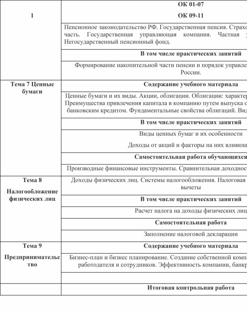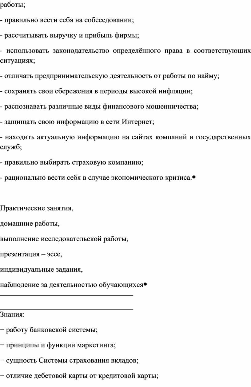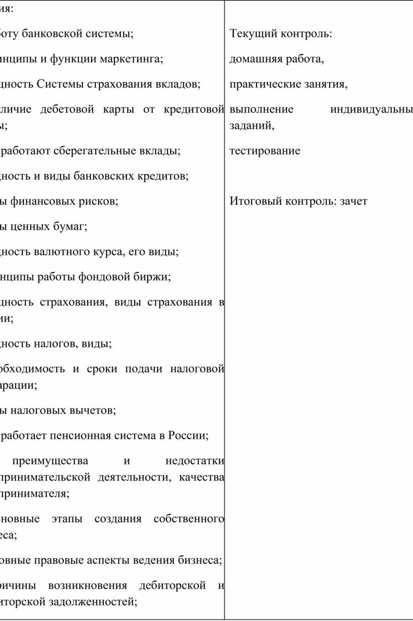 Знания: − работу банковской системы; − принципы и функции маркетинга; − сущность Системы страхования вкладов; − отличие дебетовой карты от кредитовой карты; - как работают сберегательные вклады; - сущность и виды банковских кредитов; - виды финансовых рисков; - виды ценных бумаг; - сущность валютного курса, его виды; - принципы работы фондовой биржи; - сущность страхования, виды страхования в России; - сущность налогов, виды; - необходимость и сроки подачи налоговой декларации; - виды налоговых вычетов; - как работает пенсионная система в России; - преимущества и недостатки предпринимательской деятельности, качества предпринимателя; - основные этапы создания собственного бизнеса; - основные правовые аспекты ведения бизнеса; - причины возникновения дебиторской и кредиторской задолженностей; - правила поведения в период экономического кризиса по сохранению своих сбережений; - способы сокращения финансовых рисков. |