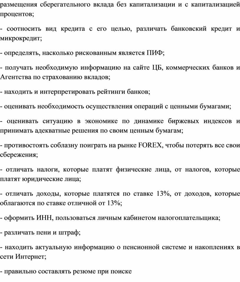 Умения: − пользоваться разнообразными финансовыми услугами, предоставляемыми банками; - оценивать надежность банка; - сравнивать условия по вкладам для выбора наиболее оптимального варианта для решения финансовых задач; - оценивать необходимость использования кредитов для решения своих финансовых проблем и проблем семьи; - принимать решения о необходимости инвестирования денежных средств тем или иным способом; - соотносить доходность и риск при размещении сбережений в банках и паевых инвестиционных фондах (ПИФах); - учитывать сумму страхового лимита при размещении банковских средств на банковских депозитах; - пользоваться банковскими картами для оплаты услуг, банкоматом; - различать дебетовую и кредитовую карты; - рассчитывать ожидаемый доход от размещения сберегательного вклада без капитализации и с капитализацией процентов; - соотносить вид кредита с его целью, различать банковский кредит и микрокредит; - определять, насколько рискованным является ПИФ; - получать необходимую информацию на сайте ЦБ, коммерческих банков и Агентства по страхованию вкладов; - находить и интерпретировать рейтинги банков; - оценивать необходимость осуществления операций с ценными бумагами; - оценивать ситуацию в экономике по динамике биржевых индексов и принимать адекватные решения по своим ценным бумагам; - противостоять соблазну поиграть на рынке FOREX, чтобы потерять все свои сбережения; - отличать налоги, которые платят физические лица, от налогов, которые платят юридические лица; - отличать доходы, которые платятся по ставке 13%, от доходов, которые облагаются по ставке отличной от 13%; - оформить ИНН, пользоваться личным кабинетом налогоплательщика; - различать пени и штраф; - находить актуальную информацию о пенсионной системе и накоплениях в сети Интернет; - правильно составлять резюме при поиске работы; - правильно вести себя на собеседовании; - рассчитывать выручку и прибыль фирмы; - использовать законодательство определённого права в соответствующих ситуациях; - отличать предпринимательскую деятельность от работы по найму; - сохранять свои сбережения в периоды высокой инфляции; - распознавать различные виды финансового мошенничества; - защищать свою информацию в сети Интернет; - находить актуальную информацию на сайтах компаний и государственных служб; - правильно выбирать страховую компанию; - рационально вести себя в случае экономического кризиса. |