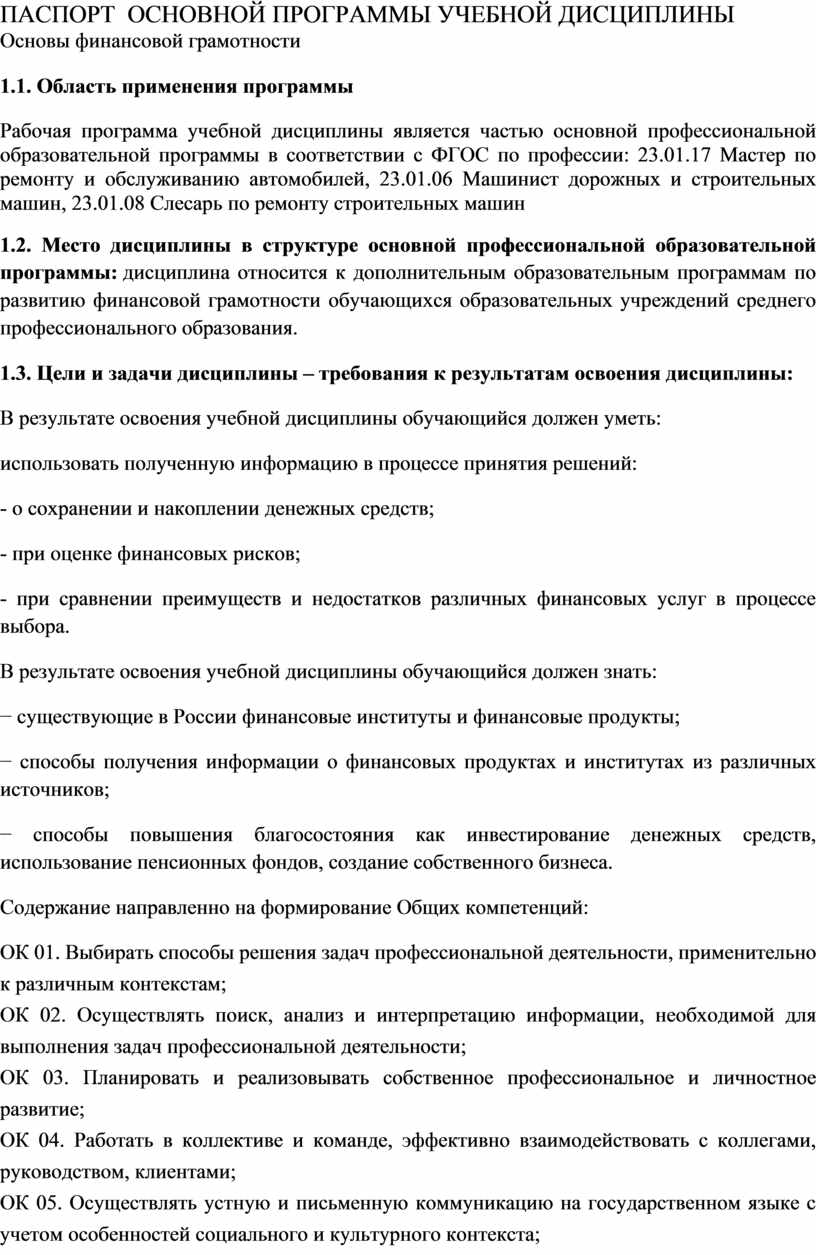 1.2. Место дисциплины в структуре основной профессиональной образовательной программы: дисциплина относится к дополнительным образовательным программам по развитию финансовой грамотности обучающихся образовательных учреждений среднего профессионального образования.
