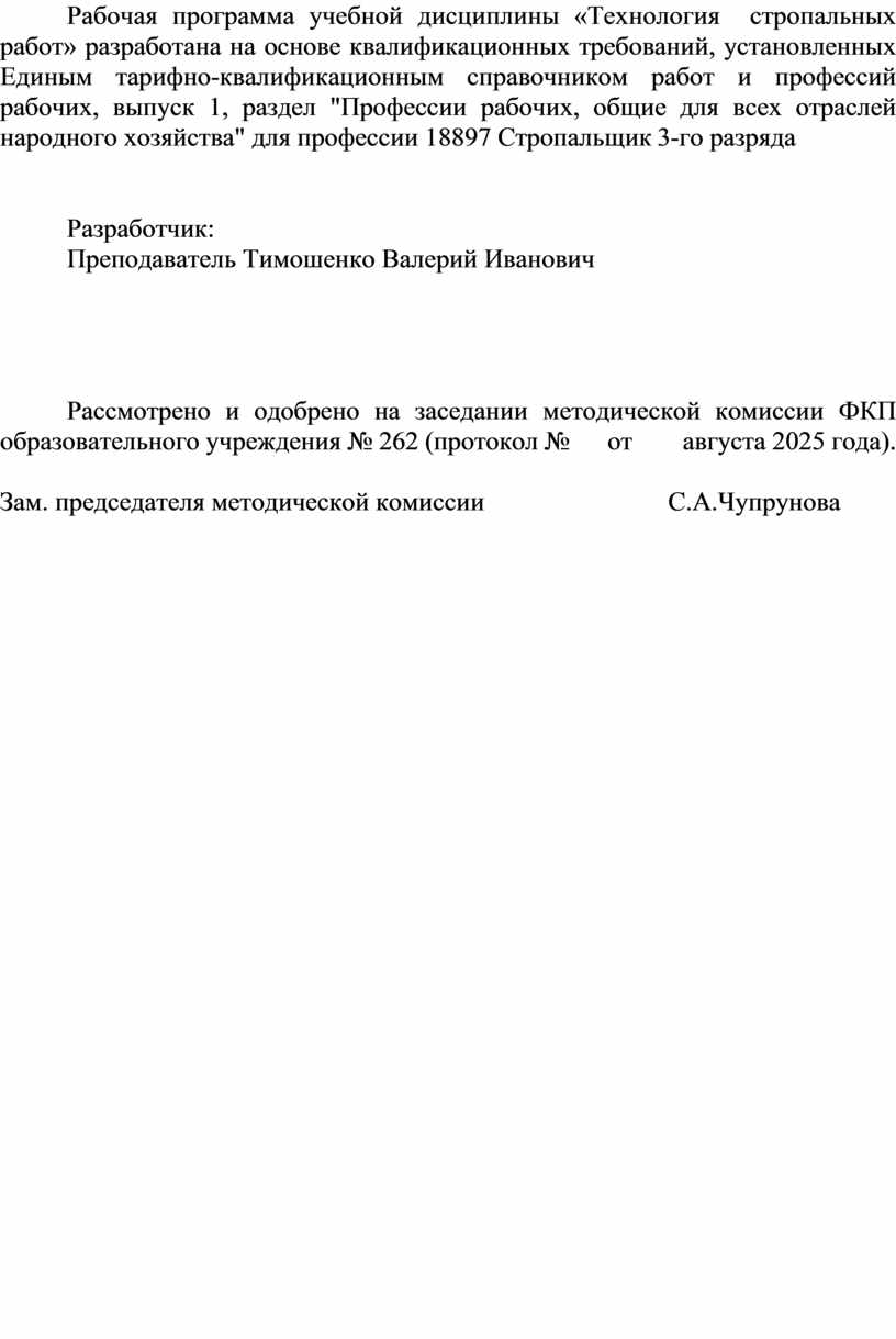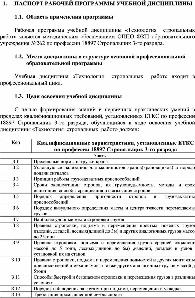 Рабочая программа учебной дисциплины «Технология стропальных работ» является методическим обеспечением ОППО ФКП образовательного учреждения №262 по профессии 18897 Стропальщик 3-го разряда.