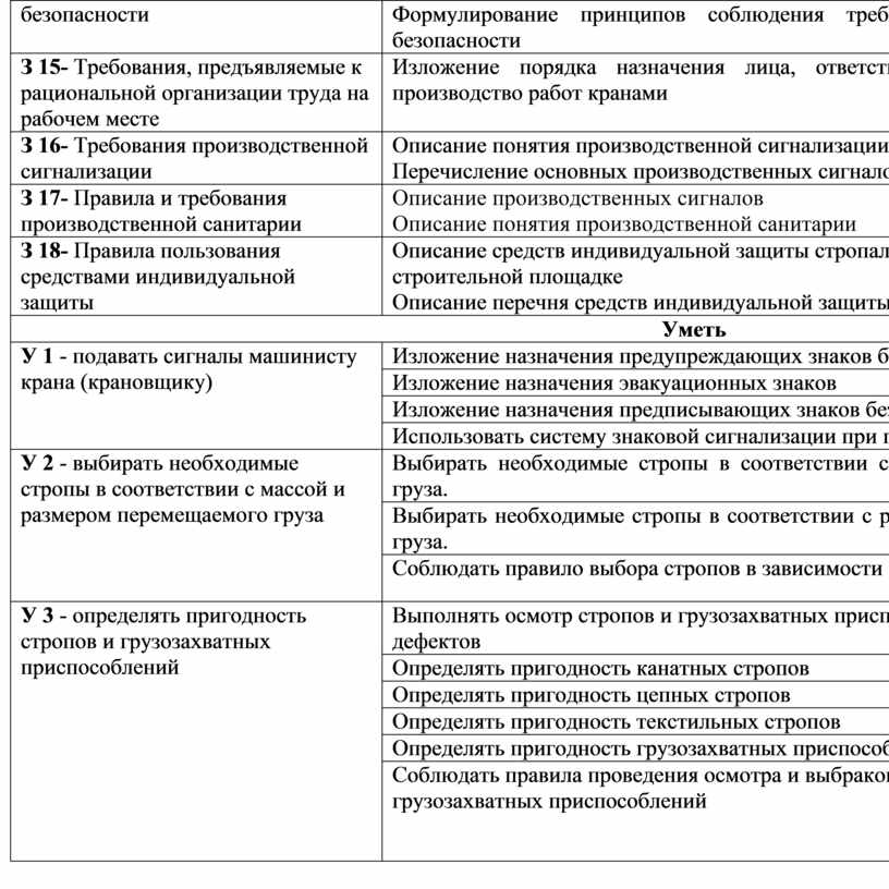 С целью формирования знаний и первичных практических умений в пределах квалификационных требований, установленных ЕТКС по профессии 18897 Стропальщик 3-го разряда, обучающийся в ходе освоения учебной дисциплины «Технология стропальных работ» должен: