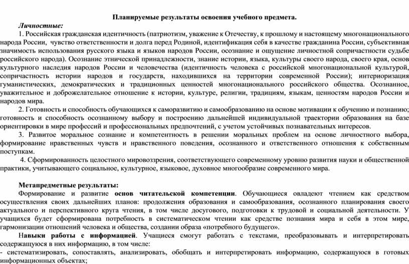 Формирование и развитие основ читательской компетенции. Обучающиеся овладеют чтением как средством осуществления своих дальнейших планов: продолжения образования и самообразования, осознанного планирования своего актуального и перспективного круга чтения, в том числе досугового, подготовки к трудовой и социальной деятельности. У учащихся будет сформирована потребность в систематическом чтении как средстве познания мира и себя в этом мире, гармонизации отношений человека и общества, создании образа «потребного будущего».