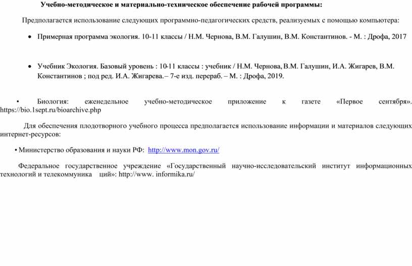 1. Примерная программа экология. 10-11 классы / Н.М. Чернова, В.М. Галушин, В.М. Константинов. - М. : Дрофа, 2017