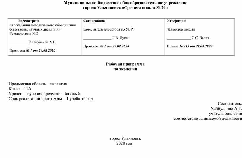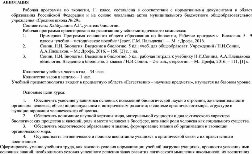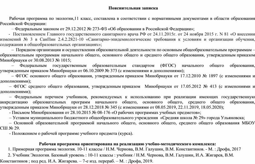 Рабочая программа по экологии, 11 класс, составлена в соответствии с нормативными документами в области образования Российской Федерации и на основе локальных актов муниципального бюджетного общеобразовательного учреждения «Средняя школа № 29».