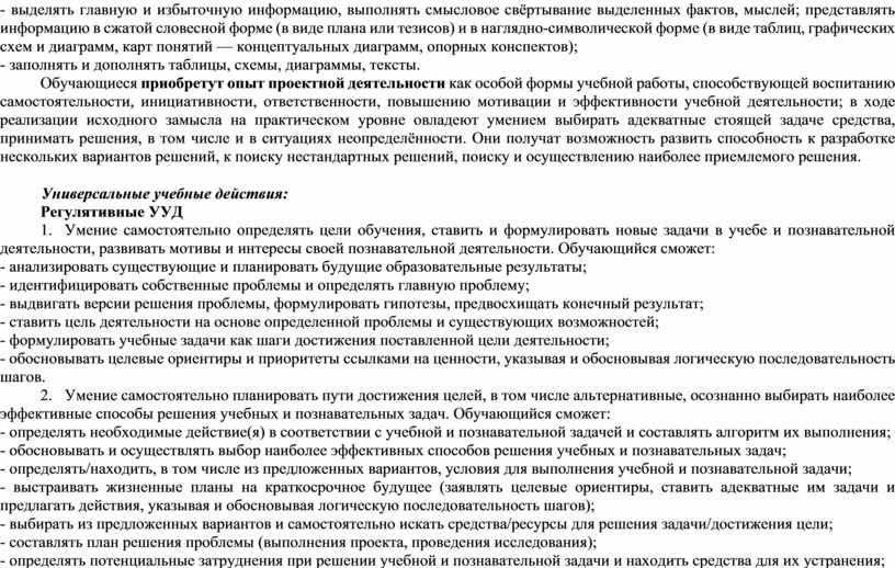 - выделять главную и избыточную информацию, выполнять смысловое свёртывание выделенных фактов, мыслей; представлять информацию в сжатой словесной форме (в виде плана или тезисов) и в наглядно-символической форме (в виде таблиц, графических схем и диаграмм, карт понятий — концептуальных диаграмм, опорных конспектов);