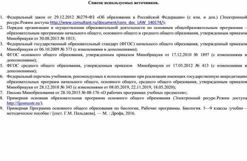 1. Примерная Программа основного общего образования по биологии, Рабочие программы. Биология. 5—9 классы :учебно – методическое пособие / [сост. Г.М. Пальдяева]. — М. : Дрофа, 2016.
