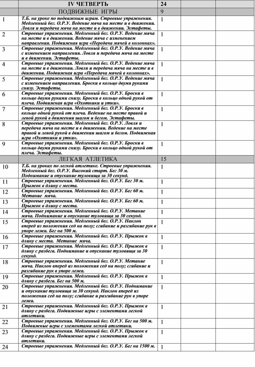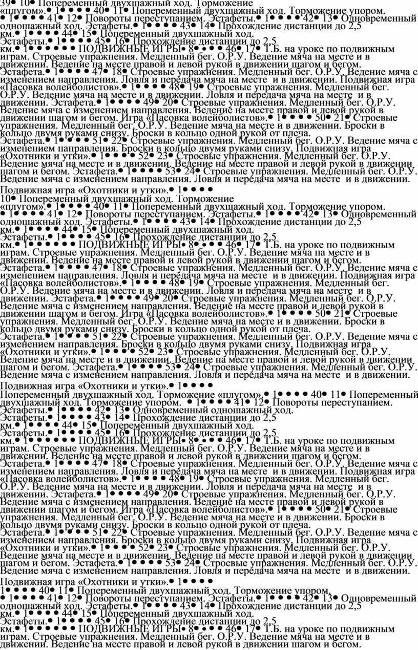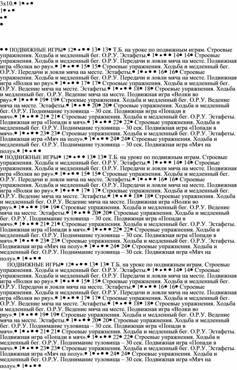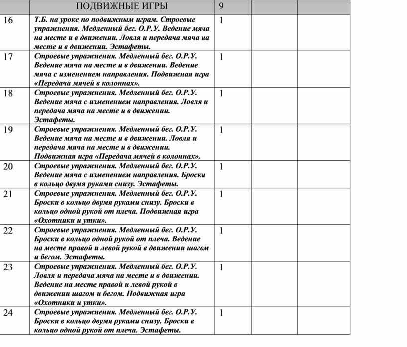 Т.Б. на уроке по подвижным играм. Строевые упражнения. Медленный бег. О.Р.У. Ведение мяча на месте и в движении. Ловля и передача мяча на месте и в движении. Эстафеты. |