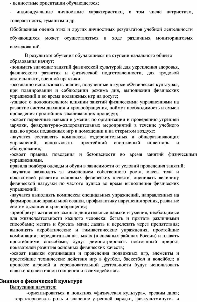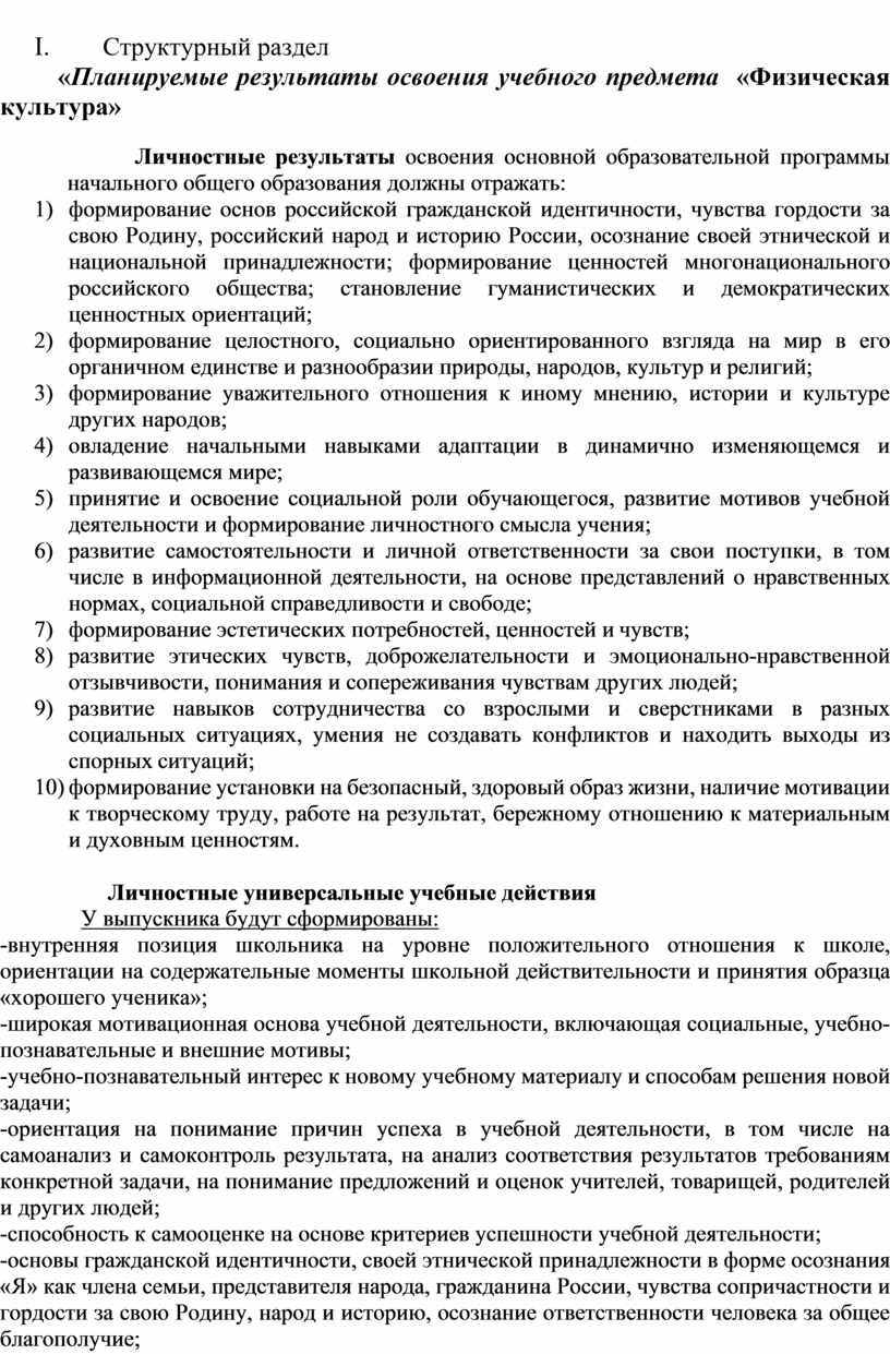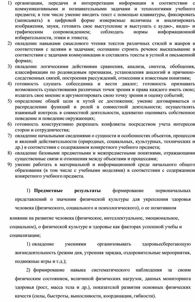 1) Предметные результаты формирование первоначальных представлений о значении физической культуры для укрепления здоровья человека (физического, социального и психологического), о ее позитивном