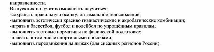 -приобретут жизненно важные двигательные навыки и умения, необходимые для жизнедеятельности каждого человека: бегать и прыгать различными способами; метать и бросать мячи; лазать и перелезать через препятствия; выполнять акробатические и гимнастические упражнения, простейшие комбинации; передвигаться на лыжах (в снежных районах России) и плавать простейшими способами; будут демонстрировать постоянный прирост показателей развития основных физических качеств;