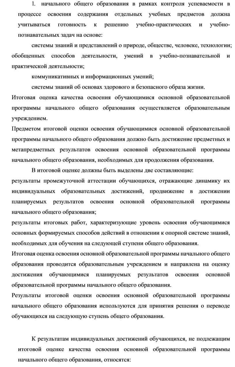Предметом итоговой оценки освоения обучающимися основной образовательной программы начального общего образования должно быть достижение предметных и метапредметных результатов освоения основной образовательной программы начального общего образования, необходимых для продолжения образования.