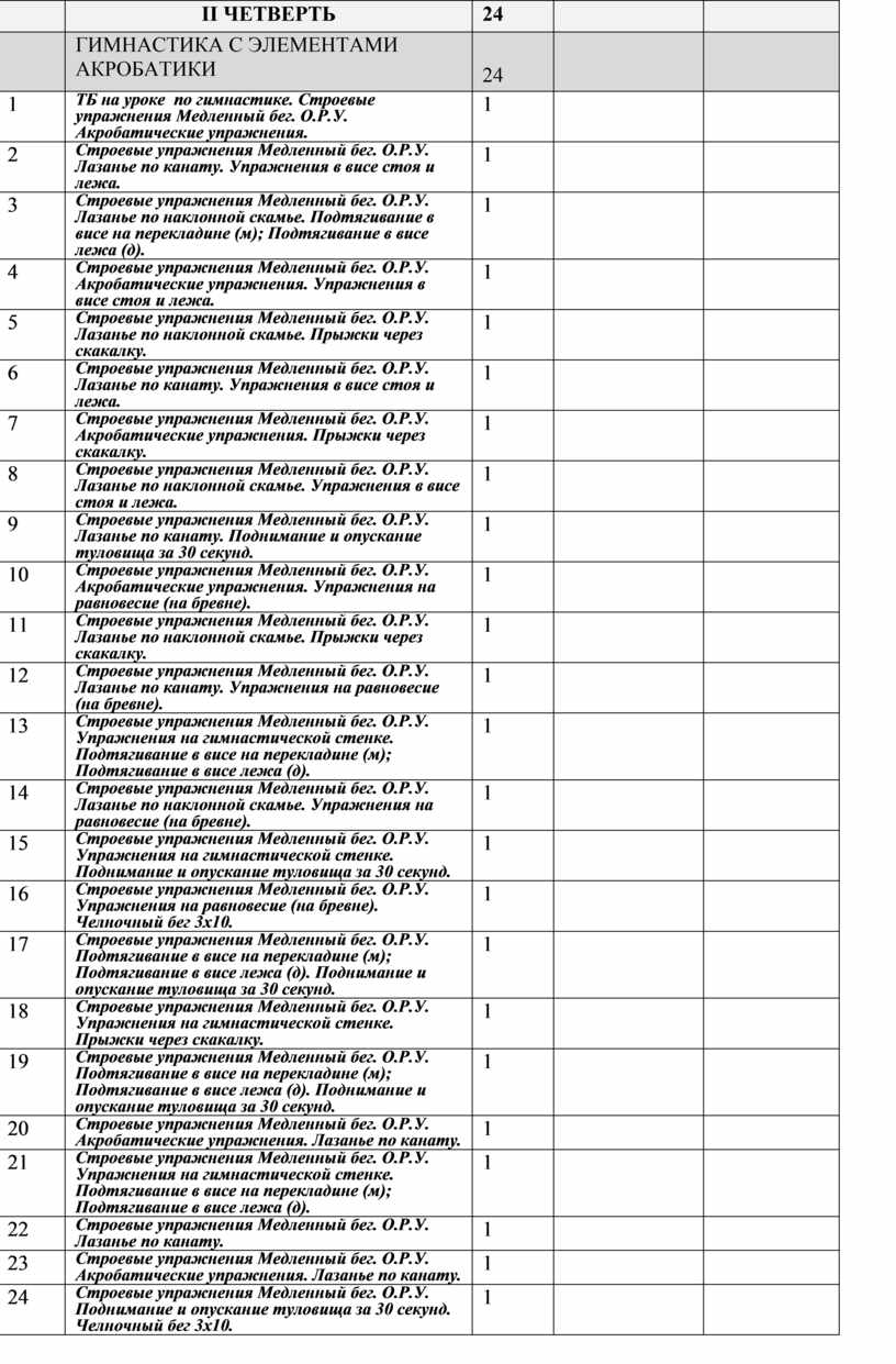 Строевые упражнения Медленный бег. О.Р.У. Акробатические упражнения. Упражнения в висе стоя и лежа. |