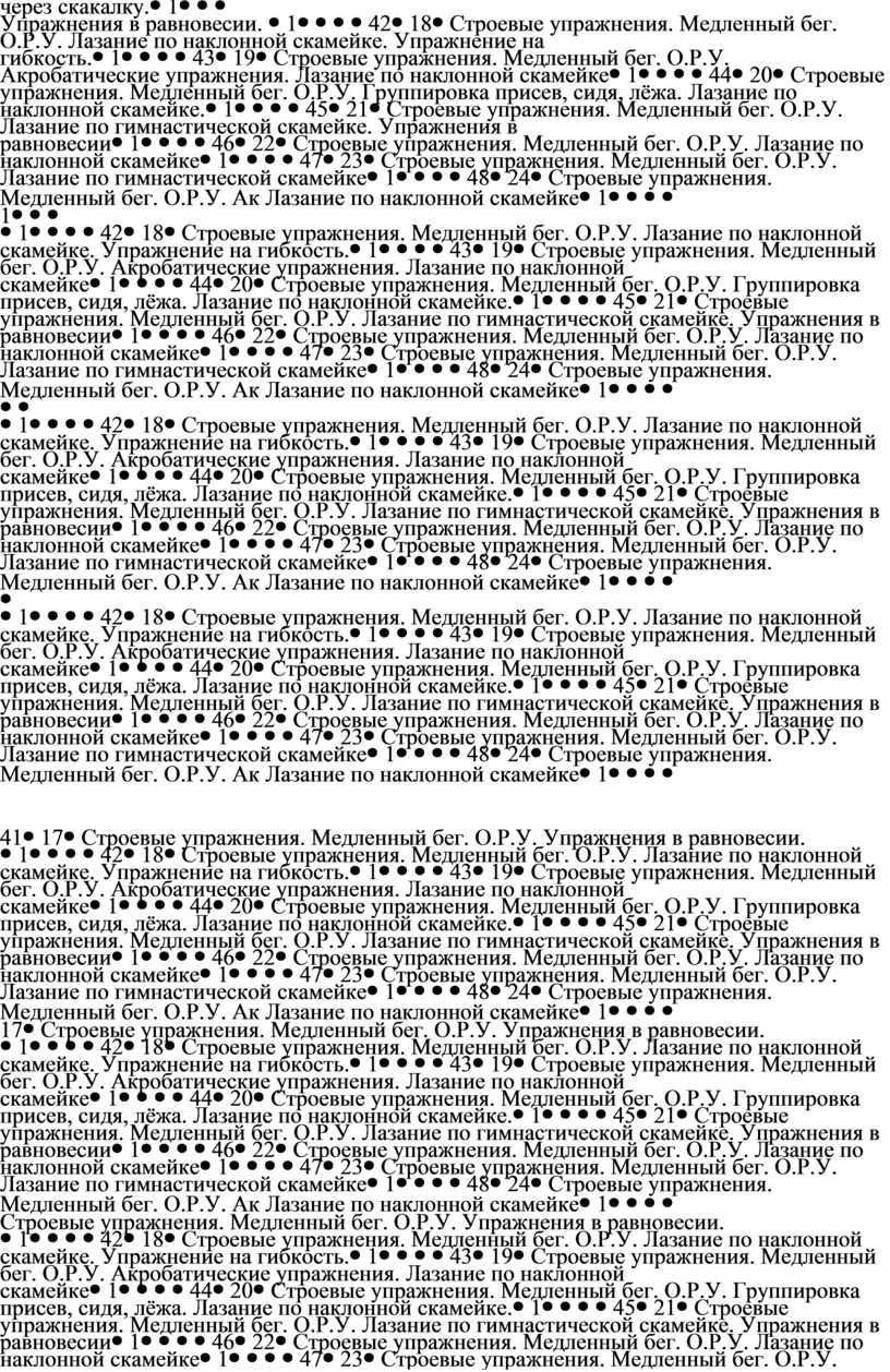 Строевые упражнения Медленный бег. О.Р.У. Лазанье по наклонной скамье. Прыжки через скакалку. |