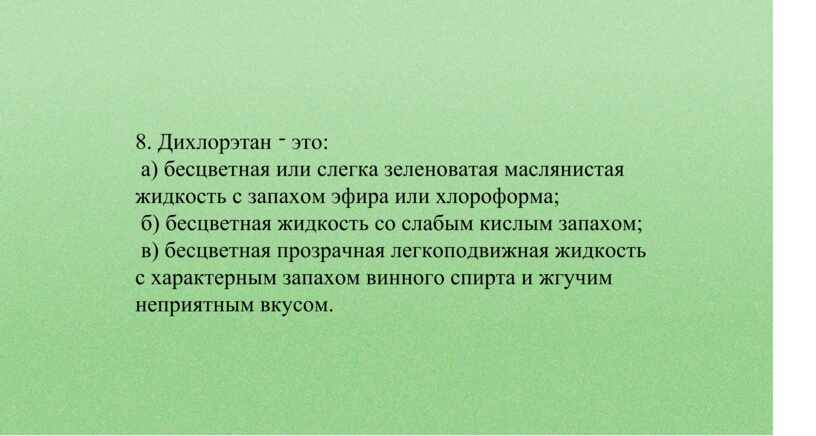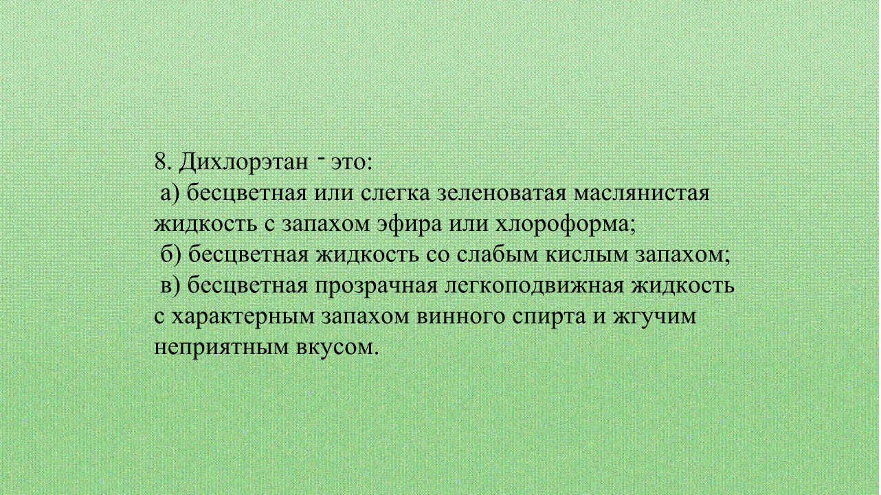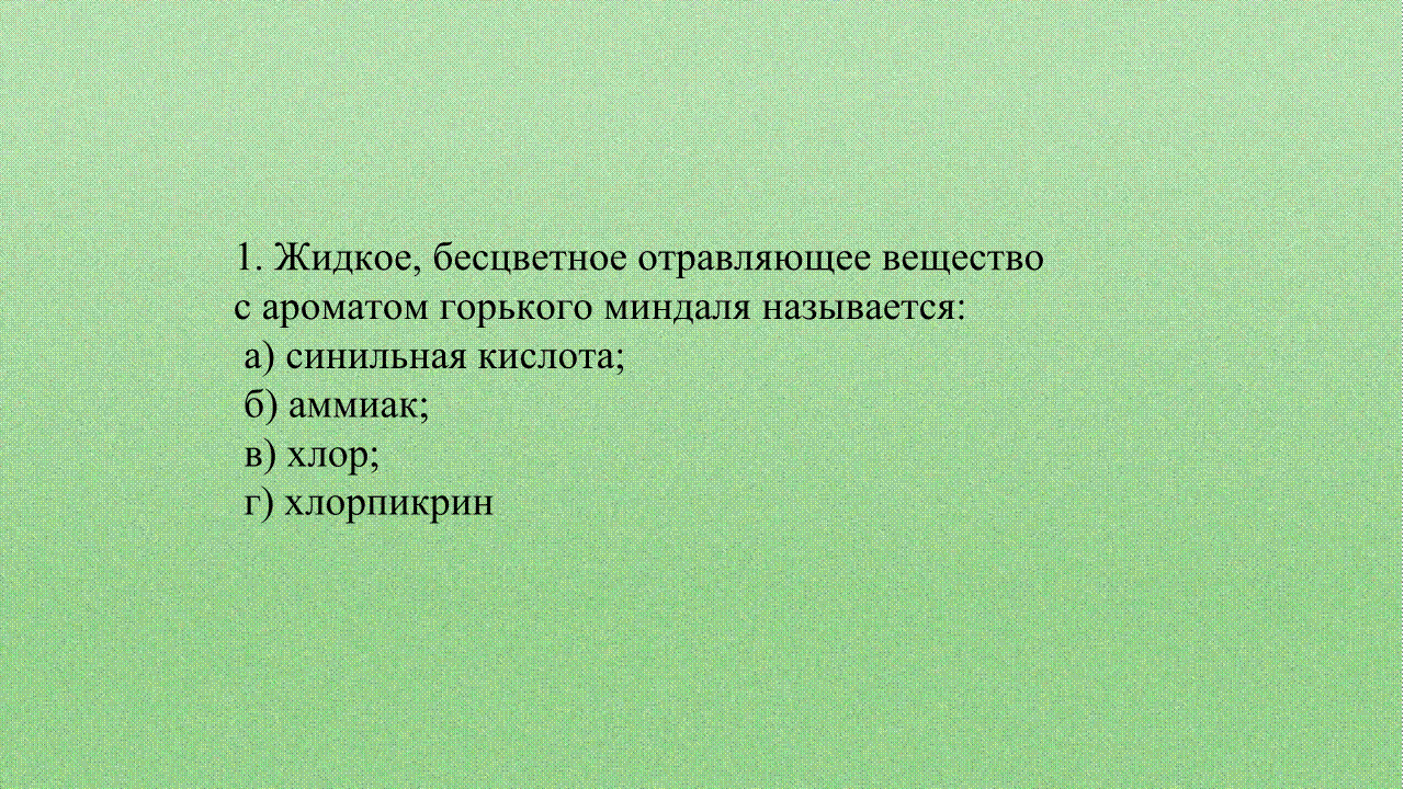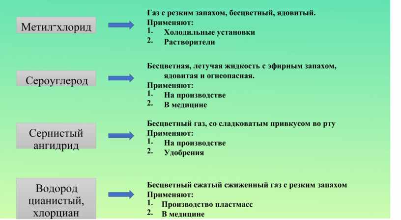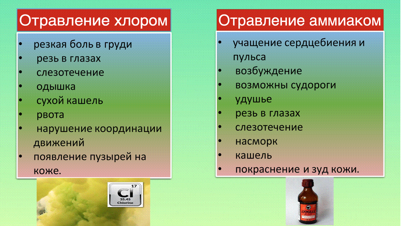 Хлор – зеленовато желтый газ с резким удушающим запахом. Плохо растворяется в воде, хорошо – в некоторых органических растворителях. В момент контакта он оказывает сильное раздражающее действие на слизистую оболочку дыхательных путей и глаза.