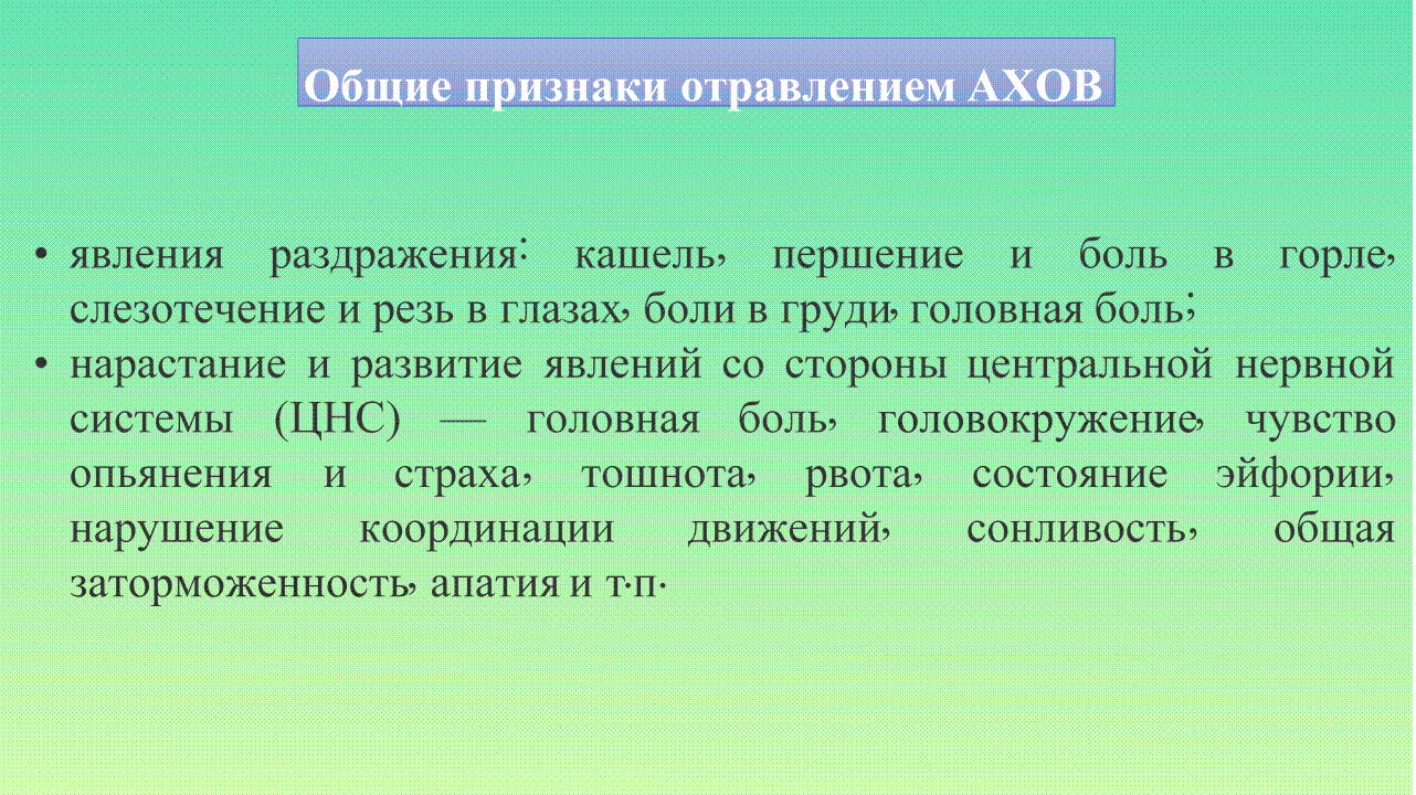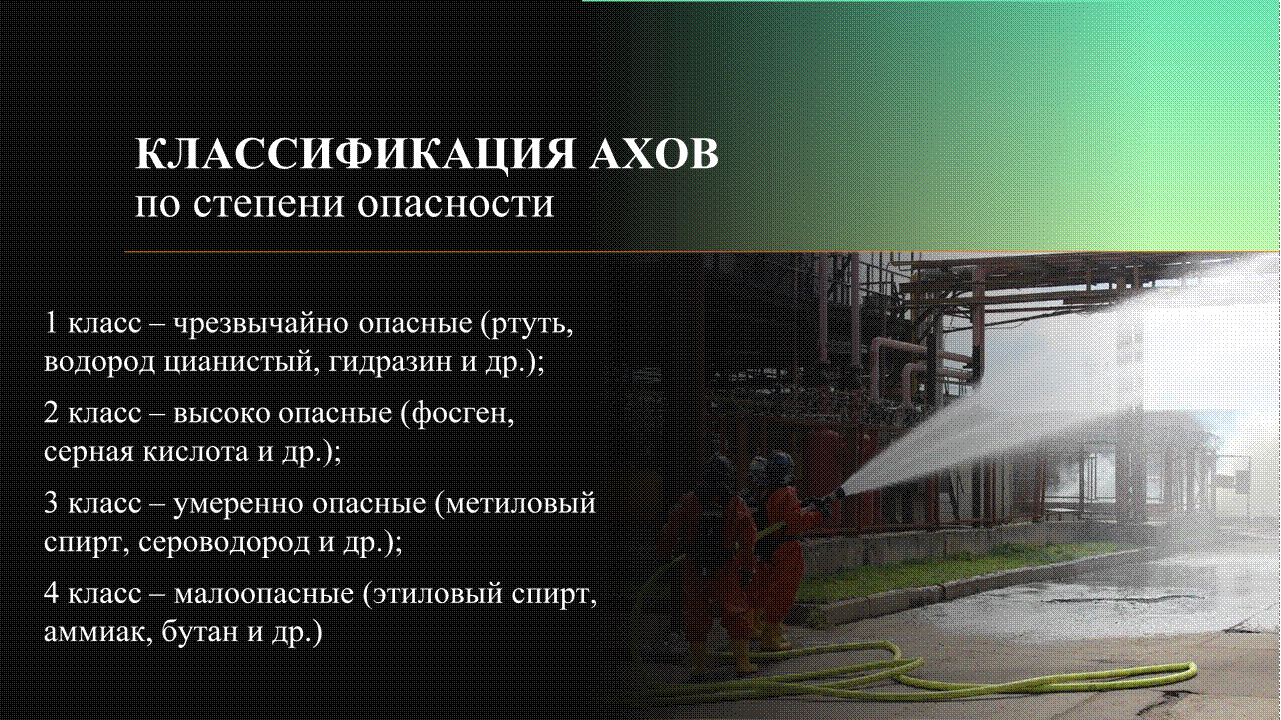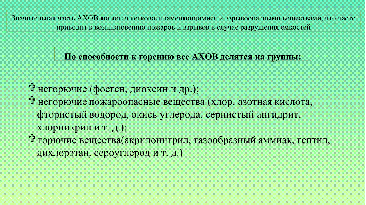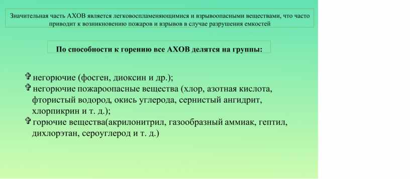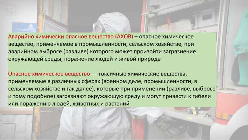 Аварийно химически опасное вещество (АХОВ) – опасное химическое вещество, применяемое в промышленности, сельском хозяйстве, при аварийном выбросе (разливе) которого может произойти загрязнение окружающей среды, поражение людей и живой природы