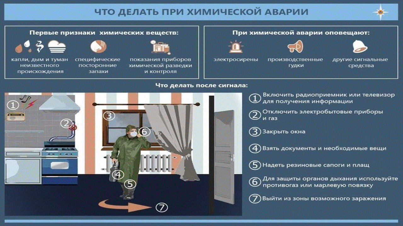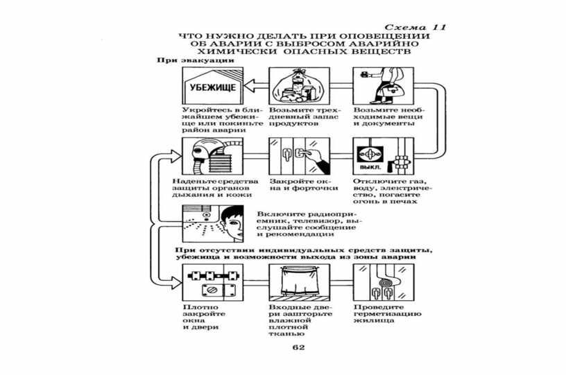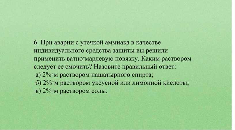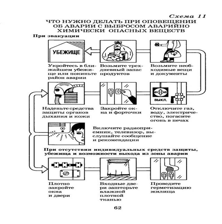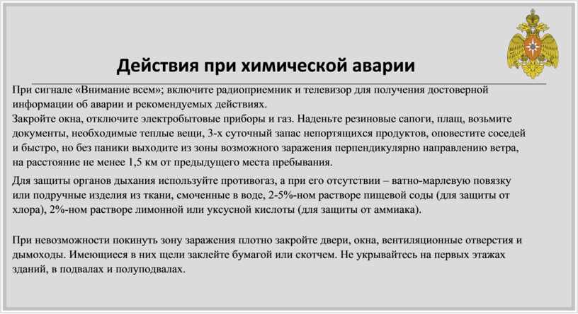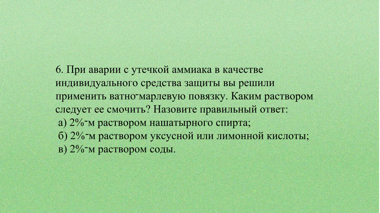 Для защиты органов дыхания используйте противогаз, а при его отсутствии – ватно-марлевую повязку или подручные изделия из ткани, смоченные в воде, 2-5%-ном растворе пищевой соды (для защиты от хлора), 2%-ном растворе лимонной или уксусной кислоты (для защиты от аммиака).