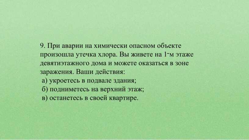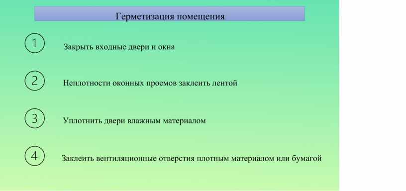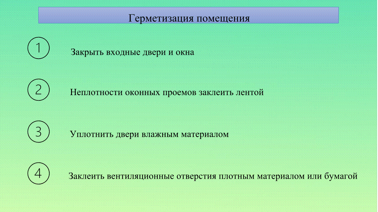 При невозможности покинуть зону заражения плотно закройте двери, окна, вентиляционные отверстия и дымоходы. Имеющиеся в них щели заклейте бумагой или скотчем. Не укрывайтесь на первых этажах зданий, в подвалах и полуподвалах.