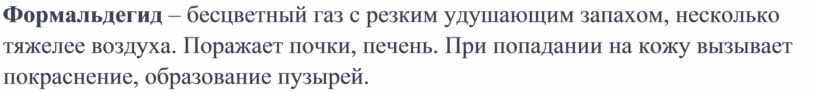 Формальдегид – бесцветный газ с резким удушающим запахом, несколько тяжелее воздуха. Поражает почки, печень. При попадании на кожу вызывает покраснение, образование пузырей.