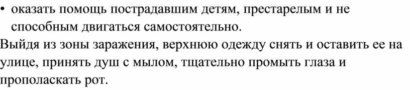 Выйдя из зоны заражения, верхнюю одежду снять и оставить ее на улице, принять душ с мылом, тщательно промыть глаза и прополаскать рот.