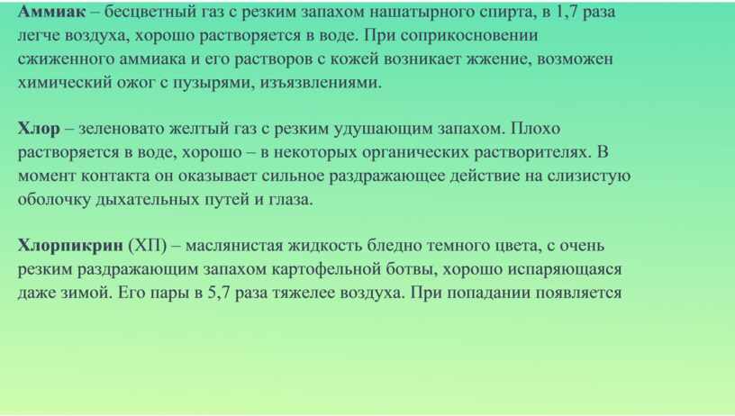 Аммиак – бесцветный газ с резким запахом нашатырного спирта, в 1,7 раза легче воздуха, хорошо растворяется в воде. При соприкосновении сжиженного аммиака и его растворов с кожей возникает жжение, возможен химический ожог с пузырями, изъязвлениями.