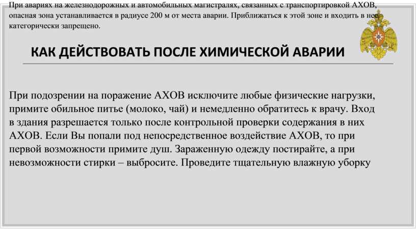 При авариях на железнодорожных и автомобильных магистралях, связанных с транспортировкой АХОВ, опасная зона устанавливается в радиусе 200 м от места аварии. Приближаться к этой зоне и входить в нее категорически запрещено.