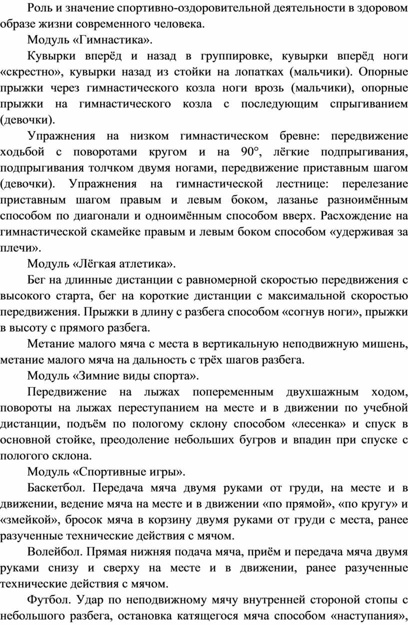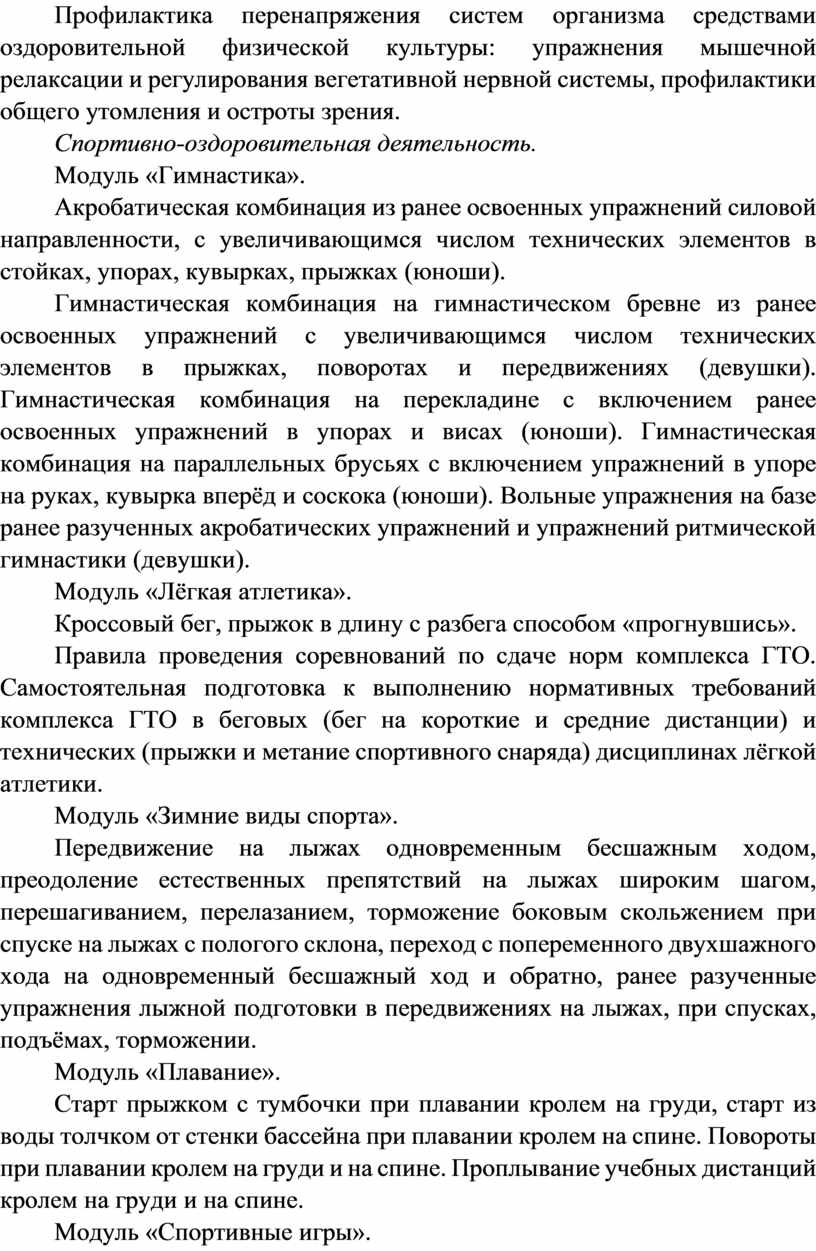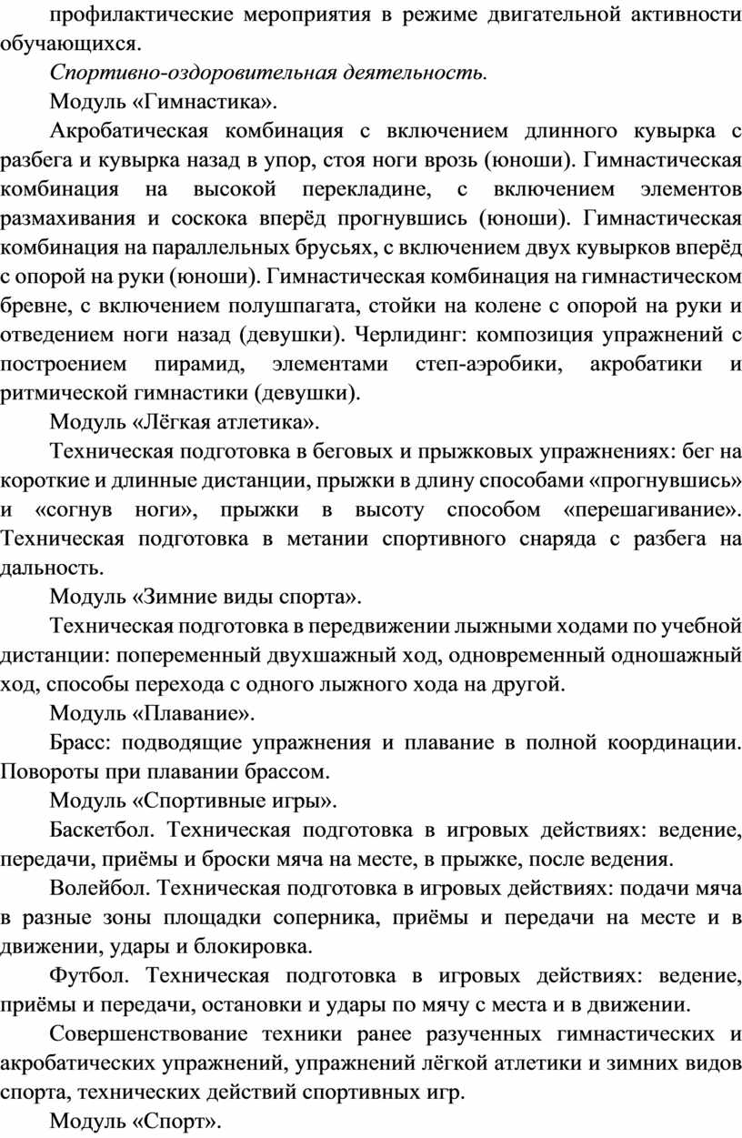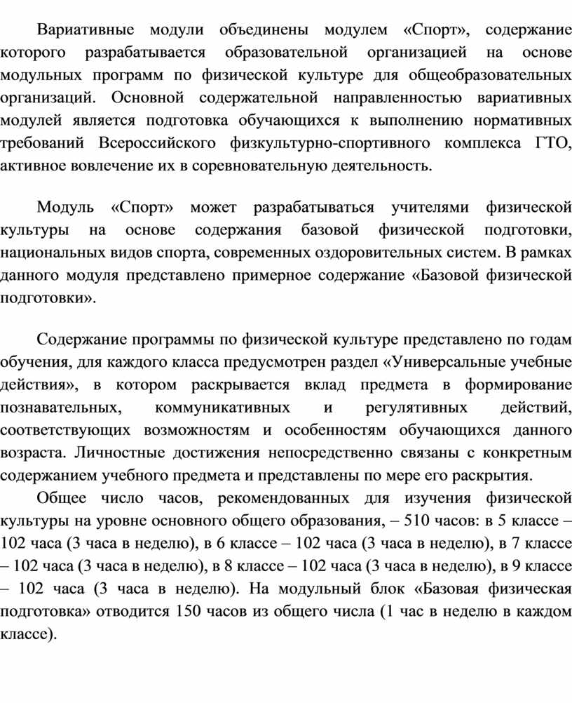 Вариативные модули объединены модулем «Спорт», содержание которого разрабатывается образовательной организацией на основе модульных программ по физической культуре для общеобразовательных организаций. Основной содержательной направленностью вариативных модулей является подготовка обучающихся к выполнению нормативных требований Всероссийского физкультурно-спортивного комплекса ГТО, активное вовлечение их в соревновательную деятельность.