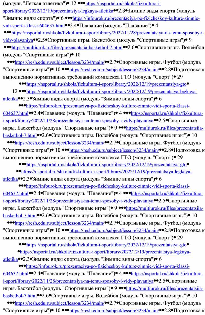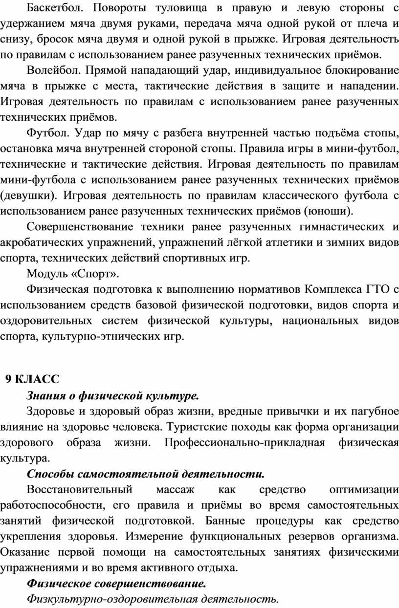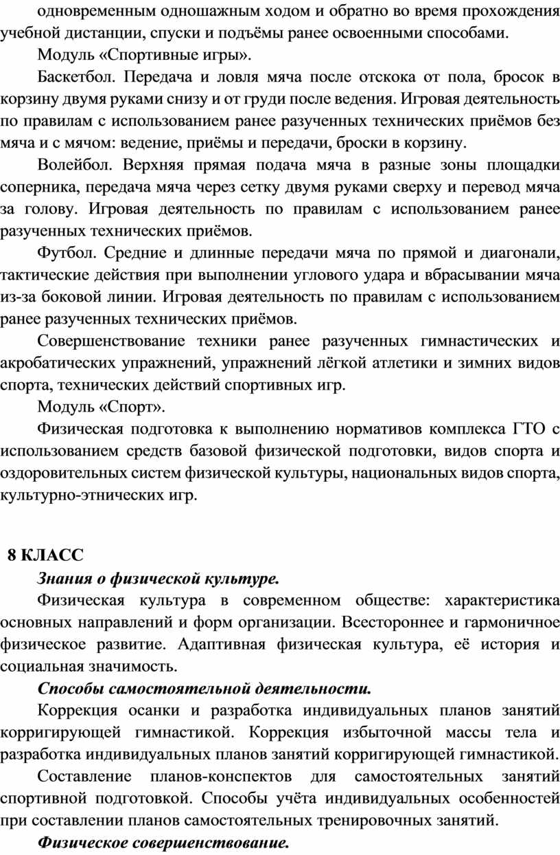 Вариативные модули объединены модулем «Спорт», содержание которого разрабатывается образовательной организацией на основе модульных программ по физической культуре для общеобразовательных организаций. Основной содержательной направленностью вариативных модулей является подготовка обучающихся к выполнению нормативных требований Всероссийского физкультурно-спортивного комплекса ГТО, активное вовлечение их в соревновательную деятельность.