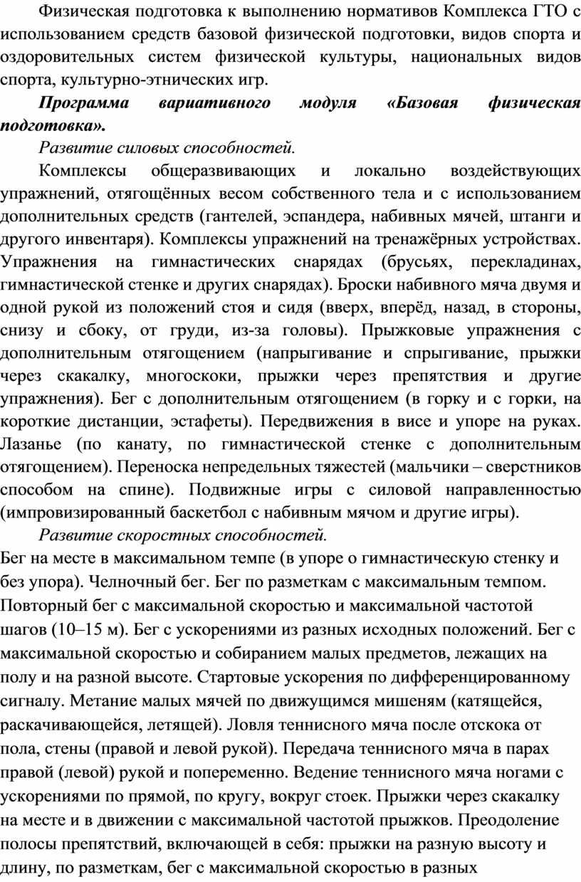 Физическая подготовка к выполнению нормативов комплекса ГТО с использованием средств базовой физической подготовки, видов спорта и оздоровительных систем физической культуры, национальных видов спорта, культурно-этнических игр.