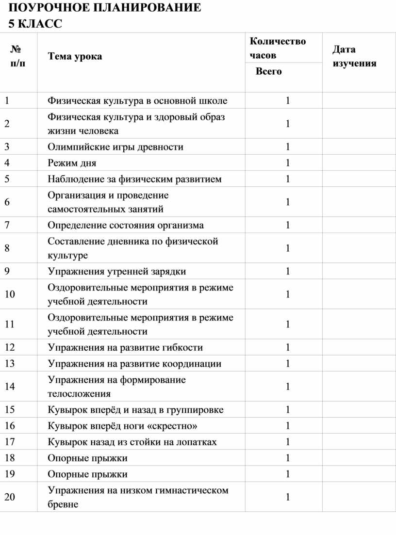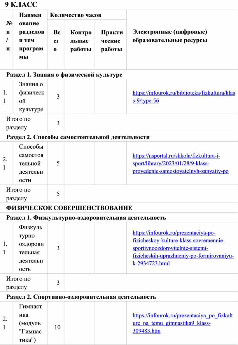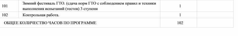 Общее число часов, рекомендованных для изучения физической культуры на уровне основного общего образования, – 510 часов: в 5 классе – 102 часа (3 часа в неделю), в 6 классе – 102 часа (3 часа в неделю), в 7 классе – 102 часа (3 часа в неделю), в 8 классе – 102 часа (3 часа в неделю), в 9 классе – 102 часа (3 часа в неделю). На модульный блок «Базовая физическая подготовка» отводится 150 часов из общего числа (1 час в неделю в каждом классе).