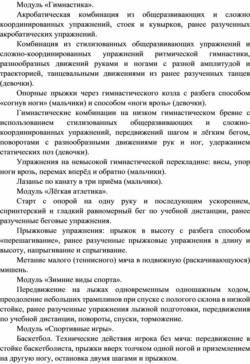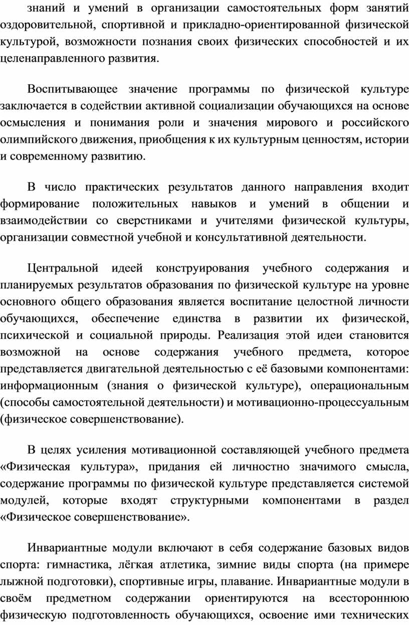 Инвариантные модули включают в себя содержание базовых видов спорта: гимнастика, лёгкая атлетика, зимние виды спорта (на примере лыжной подготовки), спортивные игры, плавание. Инвариантные модули в своём предметном содержании ориентируются на всестороннюю физическую подготовленность обучающихся, освоение ими технических действий и физических упражнений, содействующих обогащению двигательного опыта.