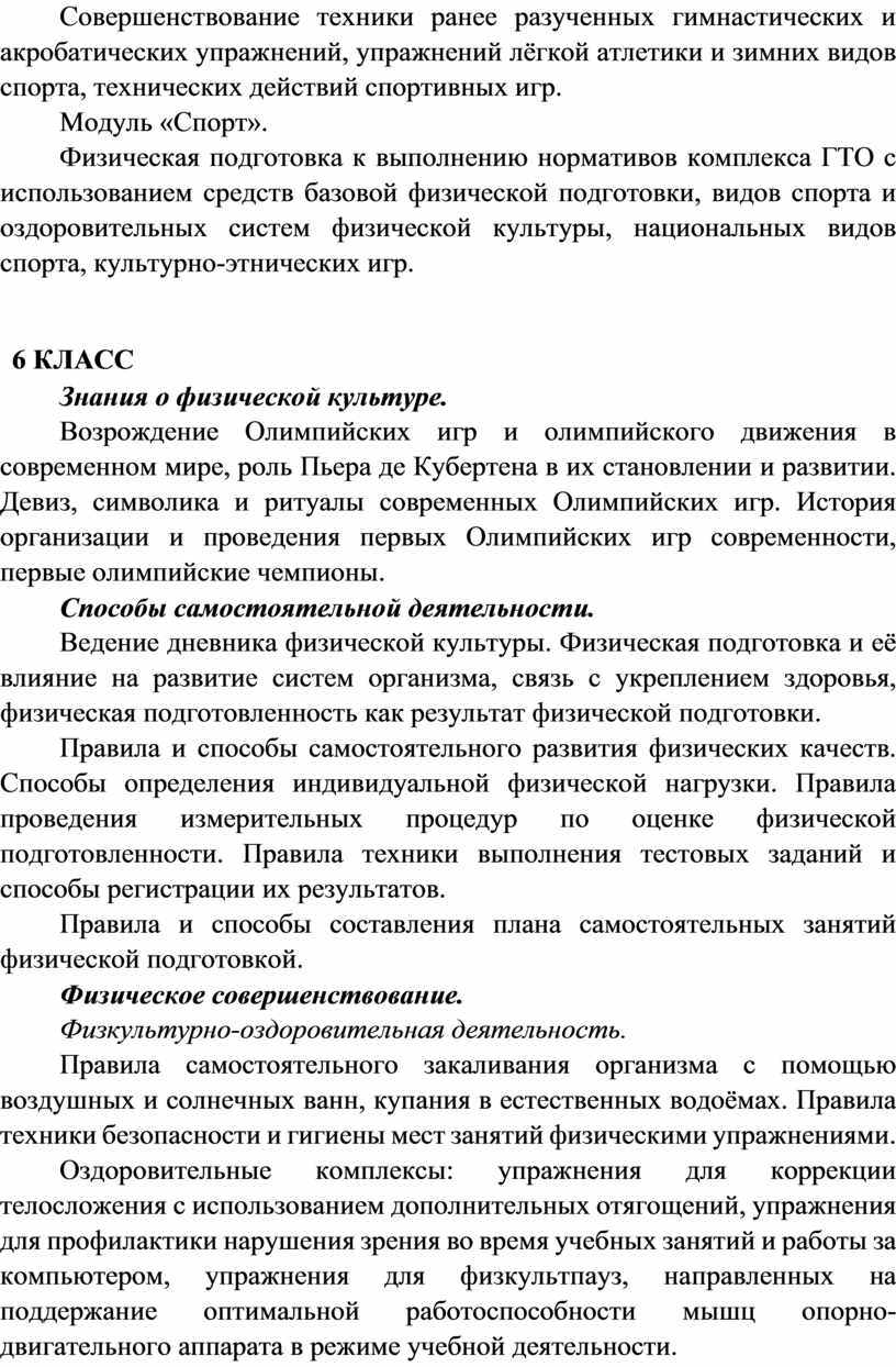 В целях усиления мотивационной составляющей учебного предмета «Физическая культура», придания ей личностно значимого смысла, содержание программы по физической культуре представляется системой модулей, которые входят структурными компонентами в раздел «Физическое совершенствование».