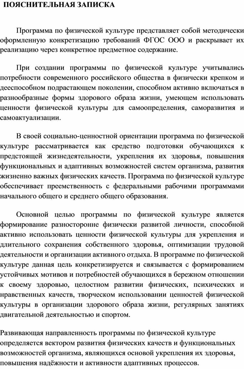 В своей социально-ценностной ориентации программа по физической культуре рассматривается как средство подготовки обучающихся к предстоящей жизнедеятельности, укрепления их здоровья, повышения функциональных и адаптивных возможностей систем организма, развития жизненно важных физических качеств. Программа по физической культуре обеспечивает преемственность с федеральными рабочими программами начального общего и среднего общего образования.