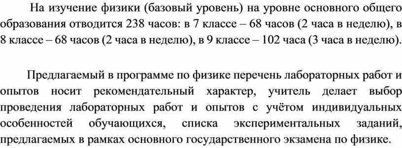На изучение физики (базовый уровень) на уровне основного общего образования отводится 238 часов: в 7 классе – 68 часов (2 часа в неделю), в 8 классе – 68 часов (2 часа в неделю), в 9 классе – 102 часа (3 часа в неделю).