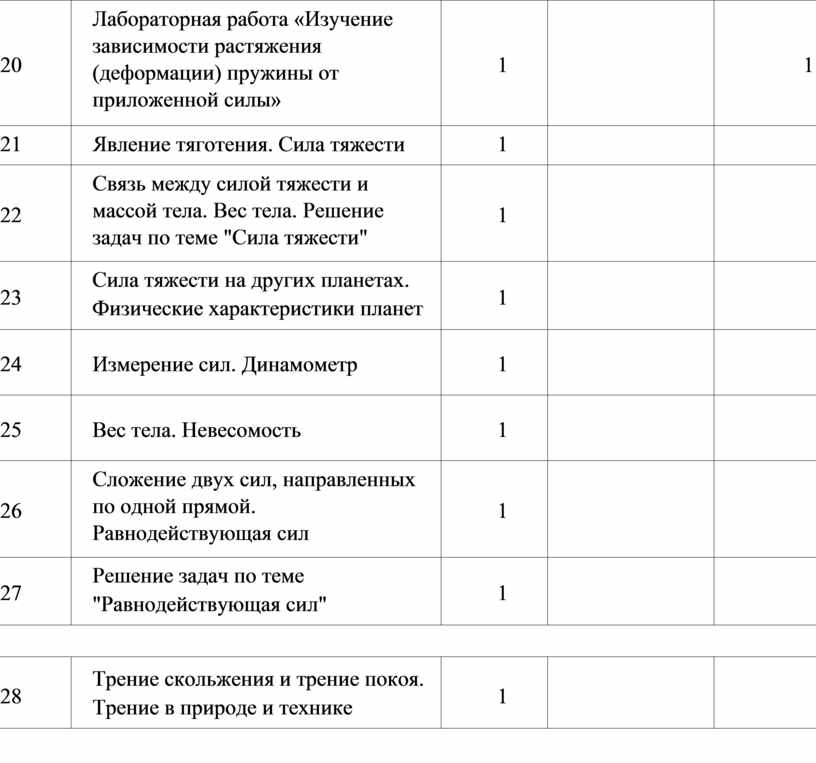 Сила как характеристика взаимодействия тел. Сила упругости и закон Гука. Измерение силы с помощью динамометра. Явление тяготения и сила тяжести. Сила тяжести на других планетах. Вес тела. Невесомость. Сложение сил, направленных по одной прямой. Равнодействующая сил. Сила трения.
