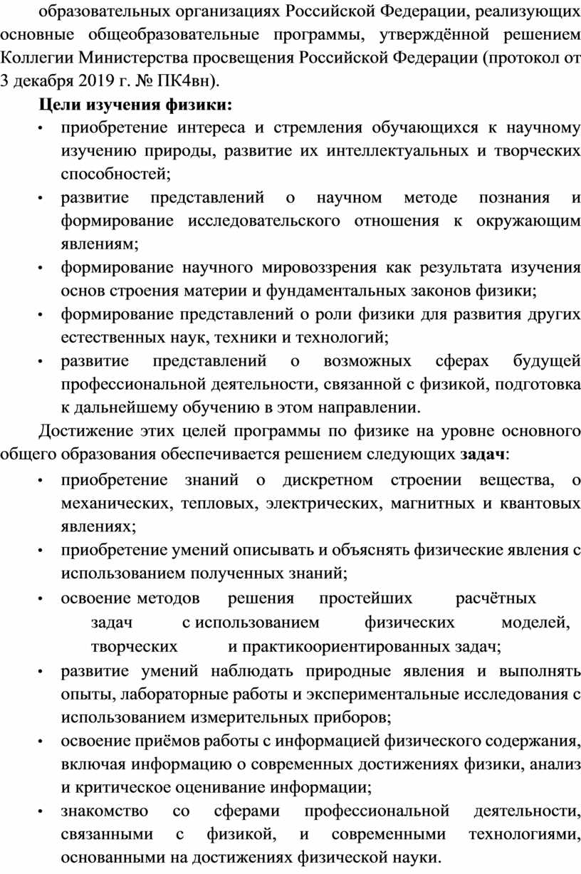 Цели изучения физики на уровне основного общего образования определены в Концепции преподавания учебного предмета «Физика» в образовательных организациях Российской Федерации, реализующих основные общеобразовательные программы, утверждённой решением Коллегии Министерства просвещения Российской Федерации (протокол от 3 декабря 2019 г. № ПК4вн).