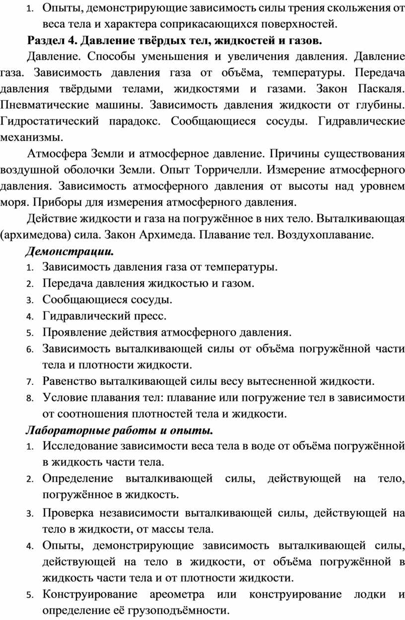 4. Опыты, демонстрирующие зависимость выталкивающей силы, действующей на тело в жидкости, от объёма погружённой в жидкость части тела и от плотности жидкости.