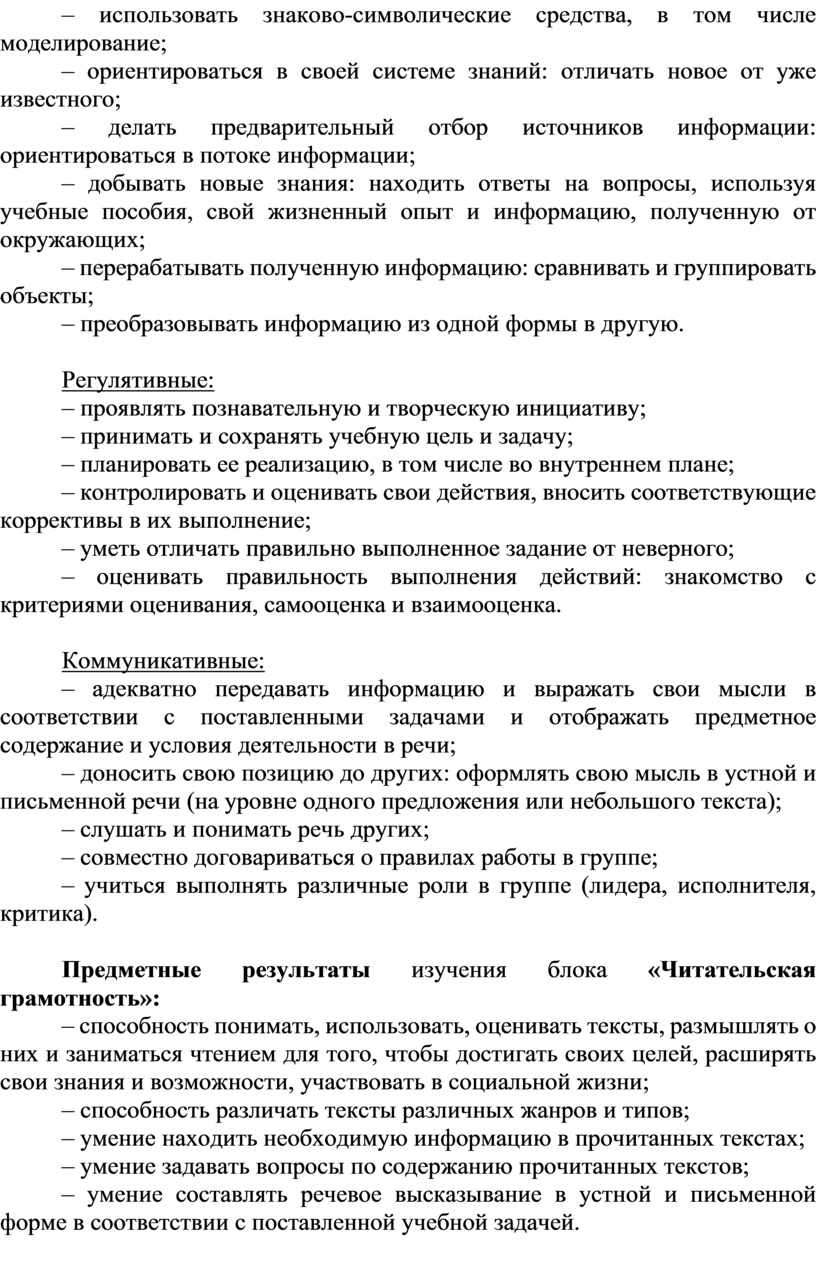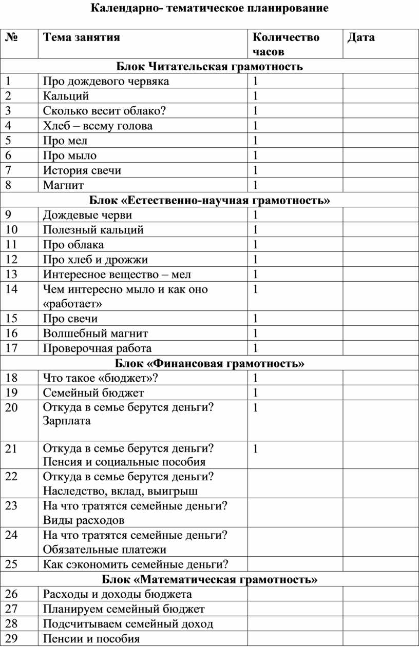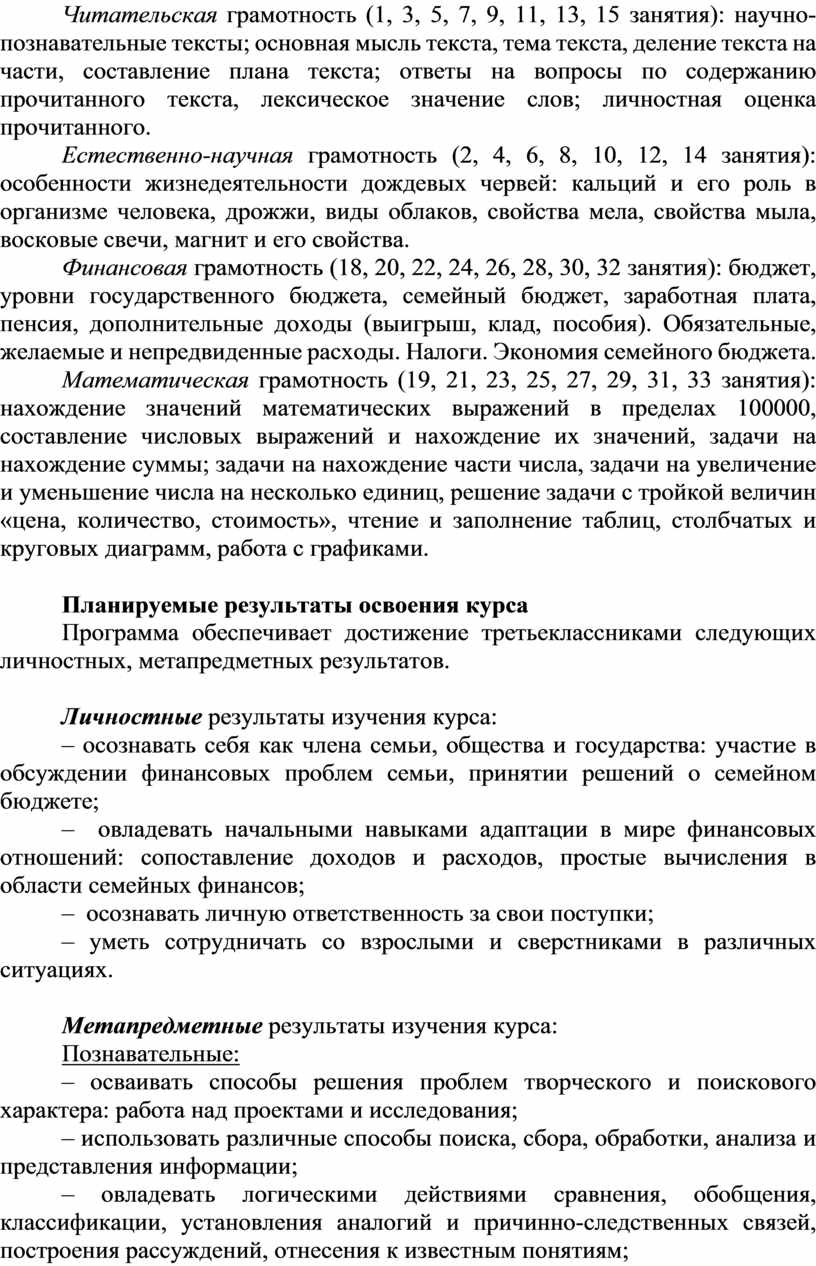 Читательская грамотность (1, 3, 5, 7, 9, 11, 13, 15 занятия): научно-познавательные тексты; основная мысль текста, тема текста, деление текста на части, составление плана текста; ответы на вопросы по содержанию прочитанного текста, лексическое значение слов; личностная оценка прочитанного.