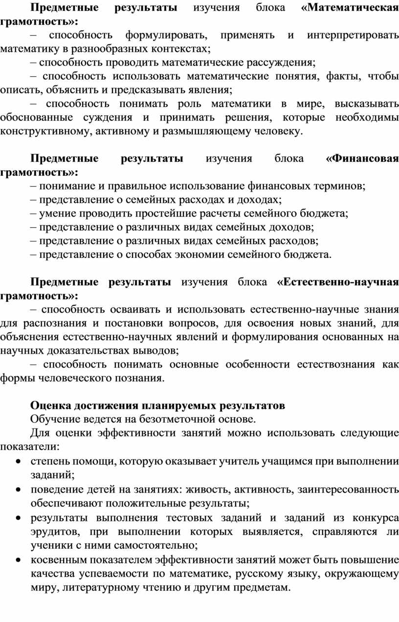 Целью изучения блока «Математическая грамотность» является формирование у обучающихся способности определять и понимать роль математики в мире, в котором они живут, высказывать хорошо обоснованные математические суждения и использовать математику так, чтобы удовлетворять в настоящем и будущем потребности, присущие созидательному, заинтересованному и мыслящему гражданину.