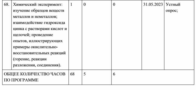 Химический эксперимент: изучение образцов веществ металлов и неметаллов; взаимодействие гидроксида цинка с растворами кислот и щелочей; проведение опытов, иллюстрирующих примеры окислительно-восстановительных реакций (горение, реакции разложения, соединения).
