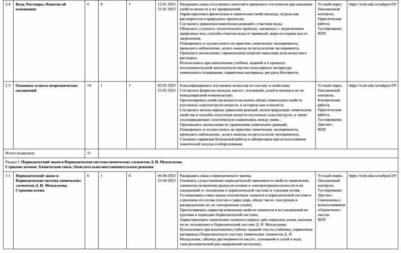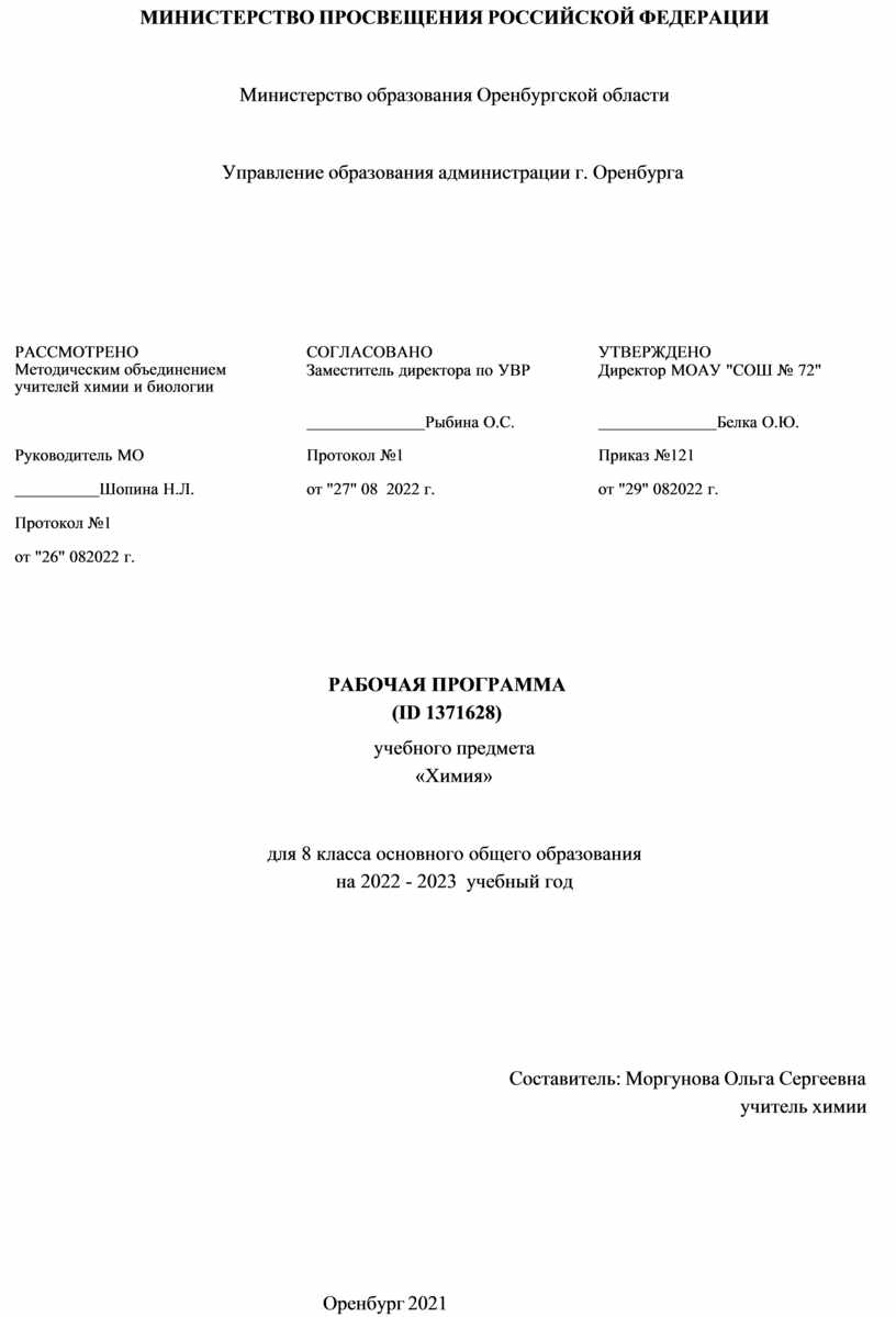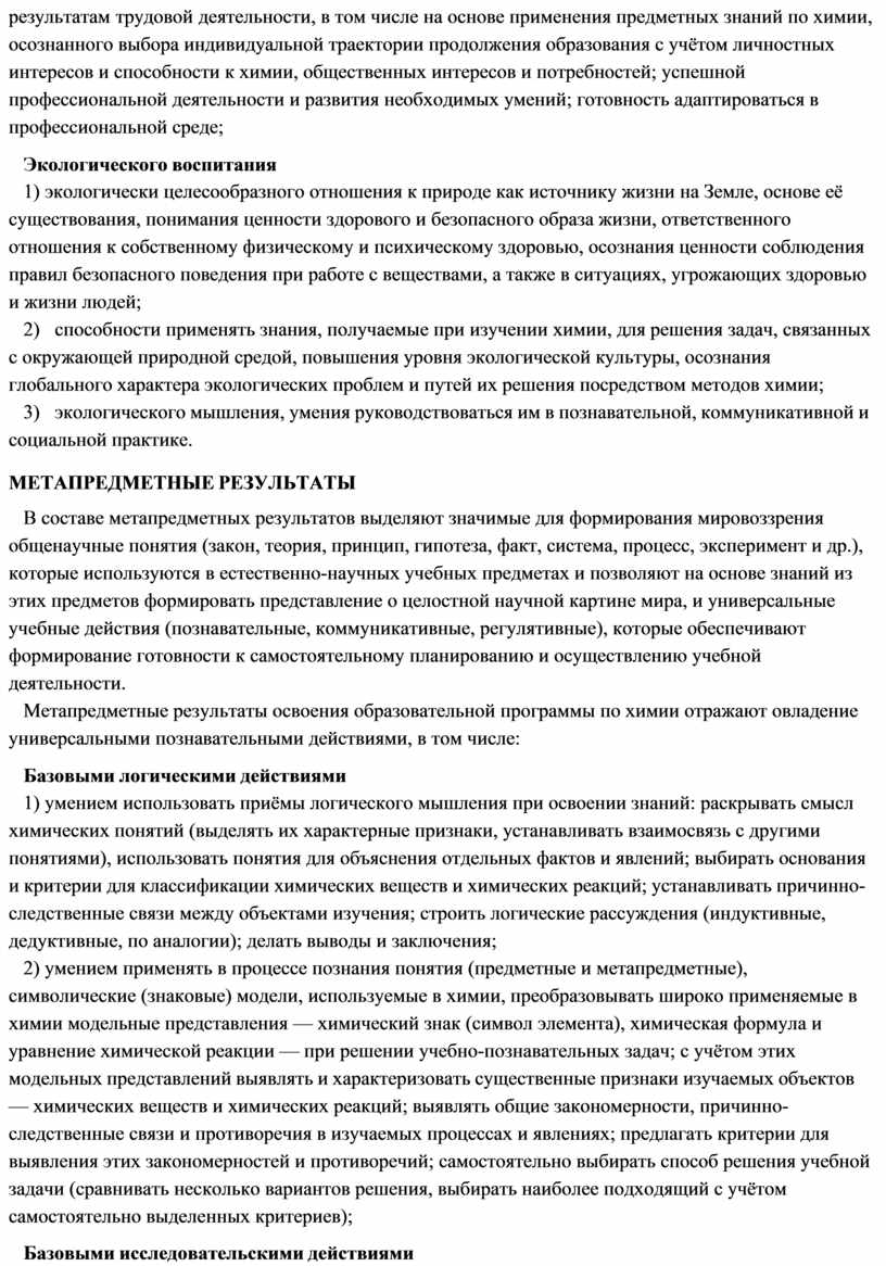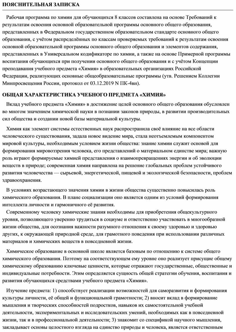 Рабочая программа по химии для обучающихся 8 классов составлена на основе Требований к результатам освоения основной образовательной программы основного общего образования, представленных в Федеральном государственном образовательном стандарте основного общего образования, с учётом распределённых по классам проверяемых требований к результатам освоения основной образовательной программы основного общего образования и элементов содержания, представленных в Универсальном кодификаторе по химии, а также на основе Примерной программы воспитания обучающихся при получении основного общего образования и с учётом Концепции преподавания учебного предмета «Химия» в образовательных организациях Российской